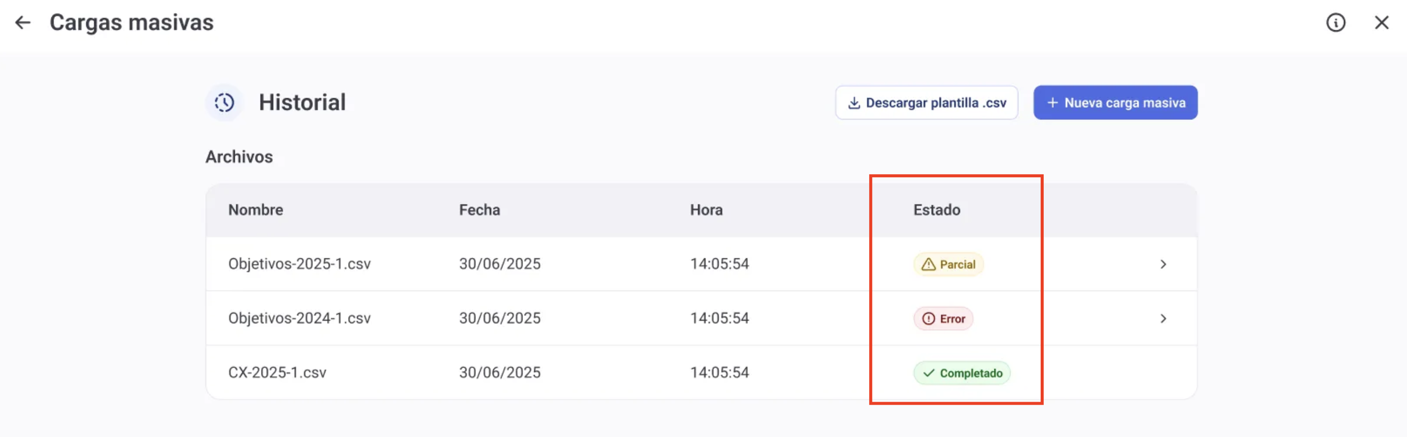 Within the objective cycle detail screen, the administrator can access the bulk upload section. You can download the reference file and upload the template with the objective data to be loaded.