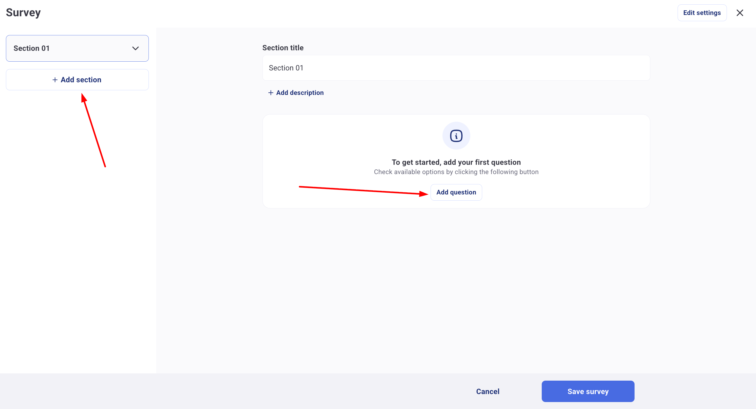 When creating a survey, a page will open where you can add questions and sections within it.