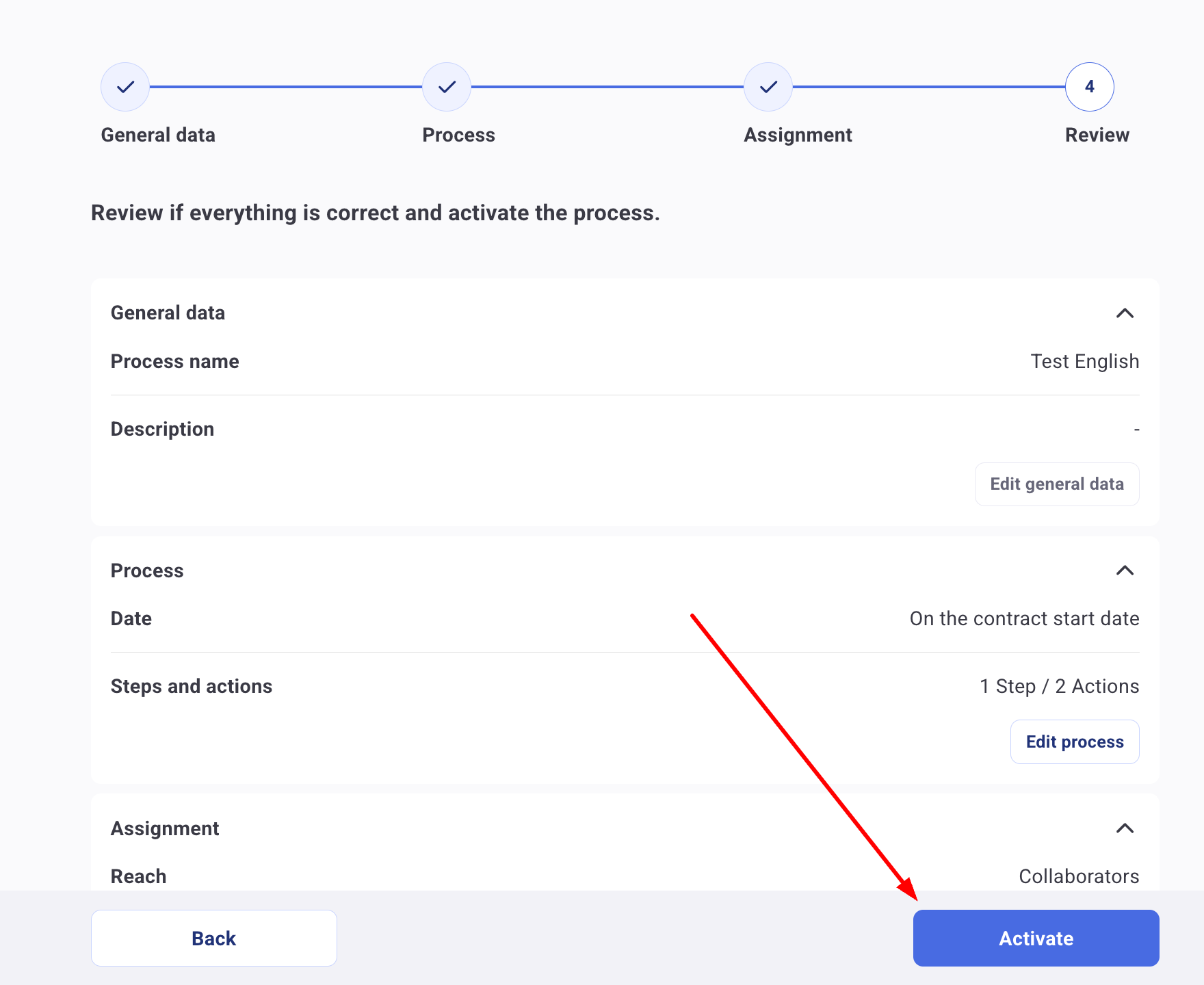 - In this section, you will review all the content and configuration of the process to confirm its creation. Once the review is confirmed, click the "Activate" button, and you're done! The process has been created.