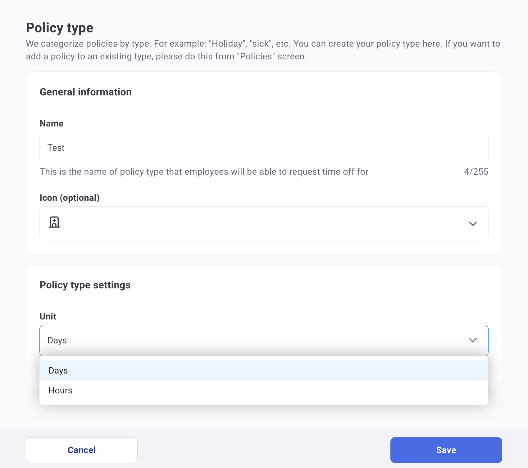 Finally, you can set the time unit you want employees to request. In this field, select the "Days" option.