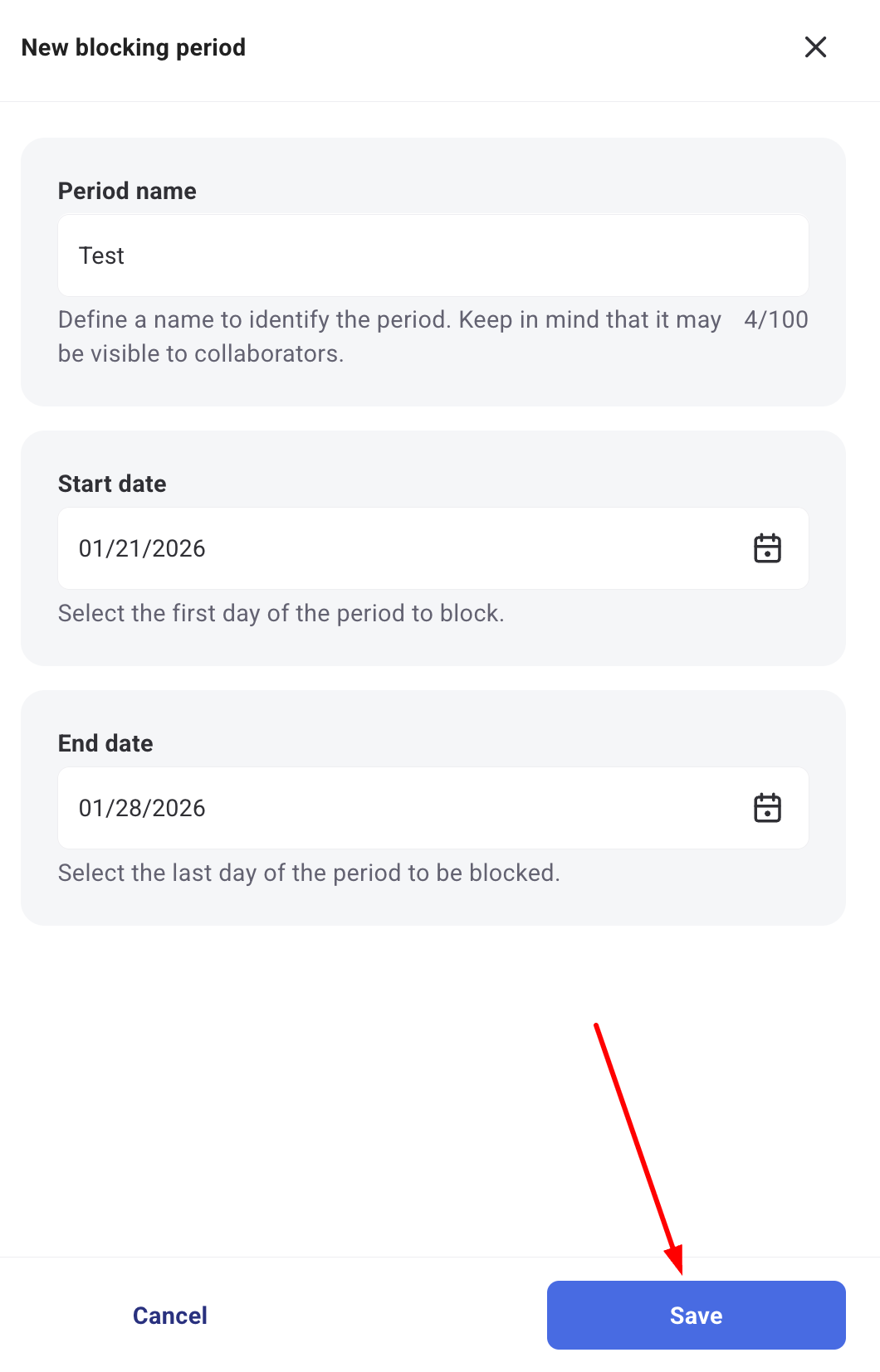 5. Next, fill in the name of the period and the dates. Once you've set it up, click "Save", and you're all set!