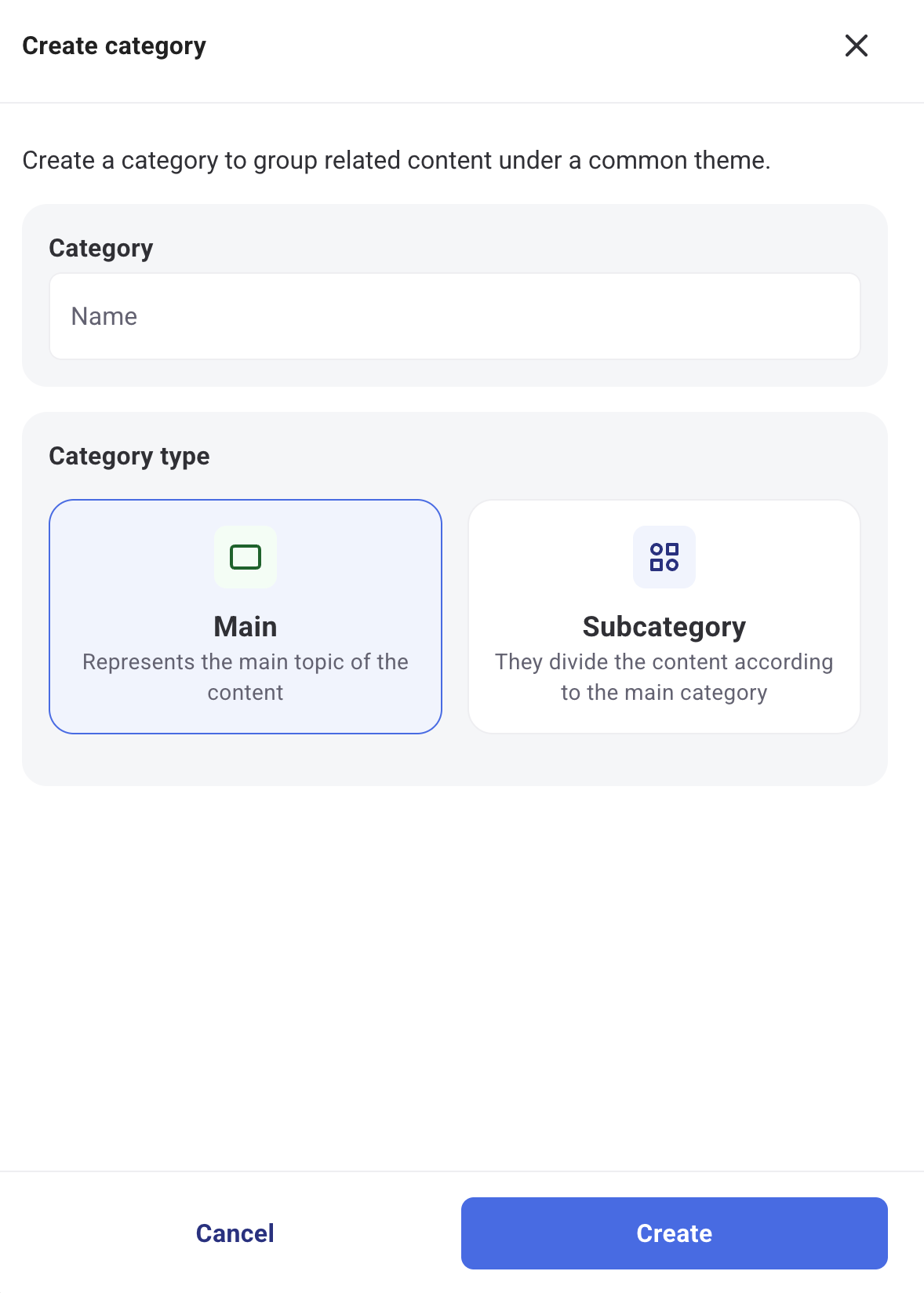 By clicking the "+ Create Category" button, you can create a new main category or a subcategory.
