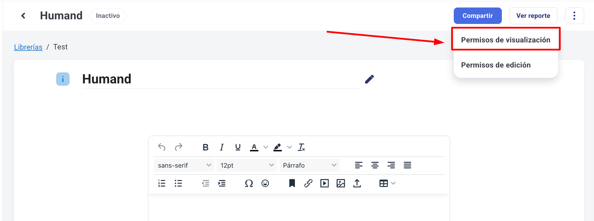 Para editar los permisos de visualización de una librería, debes seguir los pasos indicados a continuación: