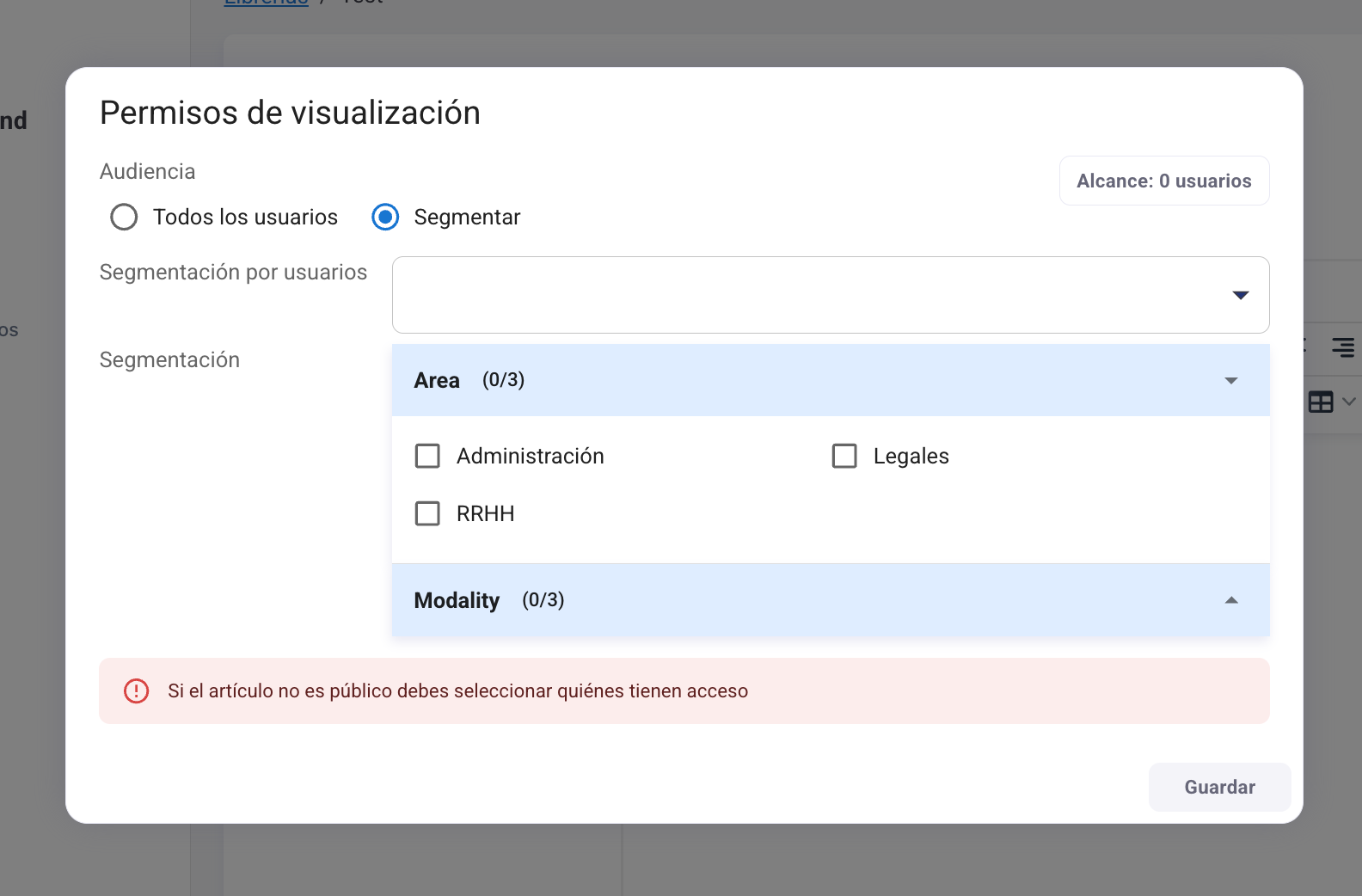 4. Una vez dentro, podrás seleccionar la opción de "Todos los usuarios" o bien segmentar el artículo para determinados usuarios.