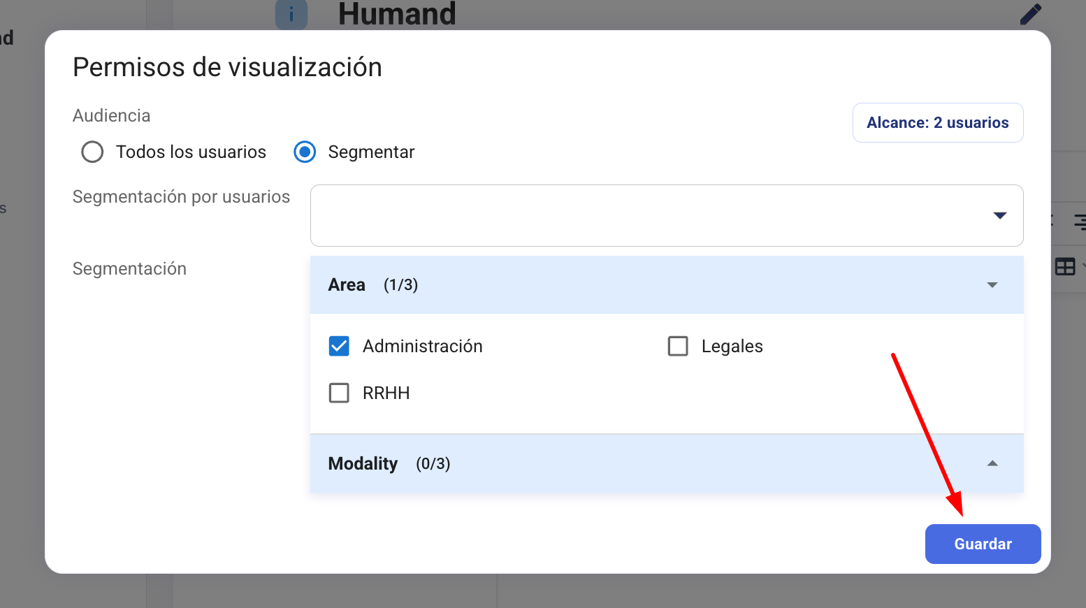 Como la mayoría de los contenidos dentro de la comunidad, las Librerías también podrás ser segmentadas, ya sea por usuarios y/o por Segmentación, para que todos o algunos de los colaboradores puedan visualizarlas.