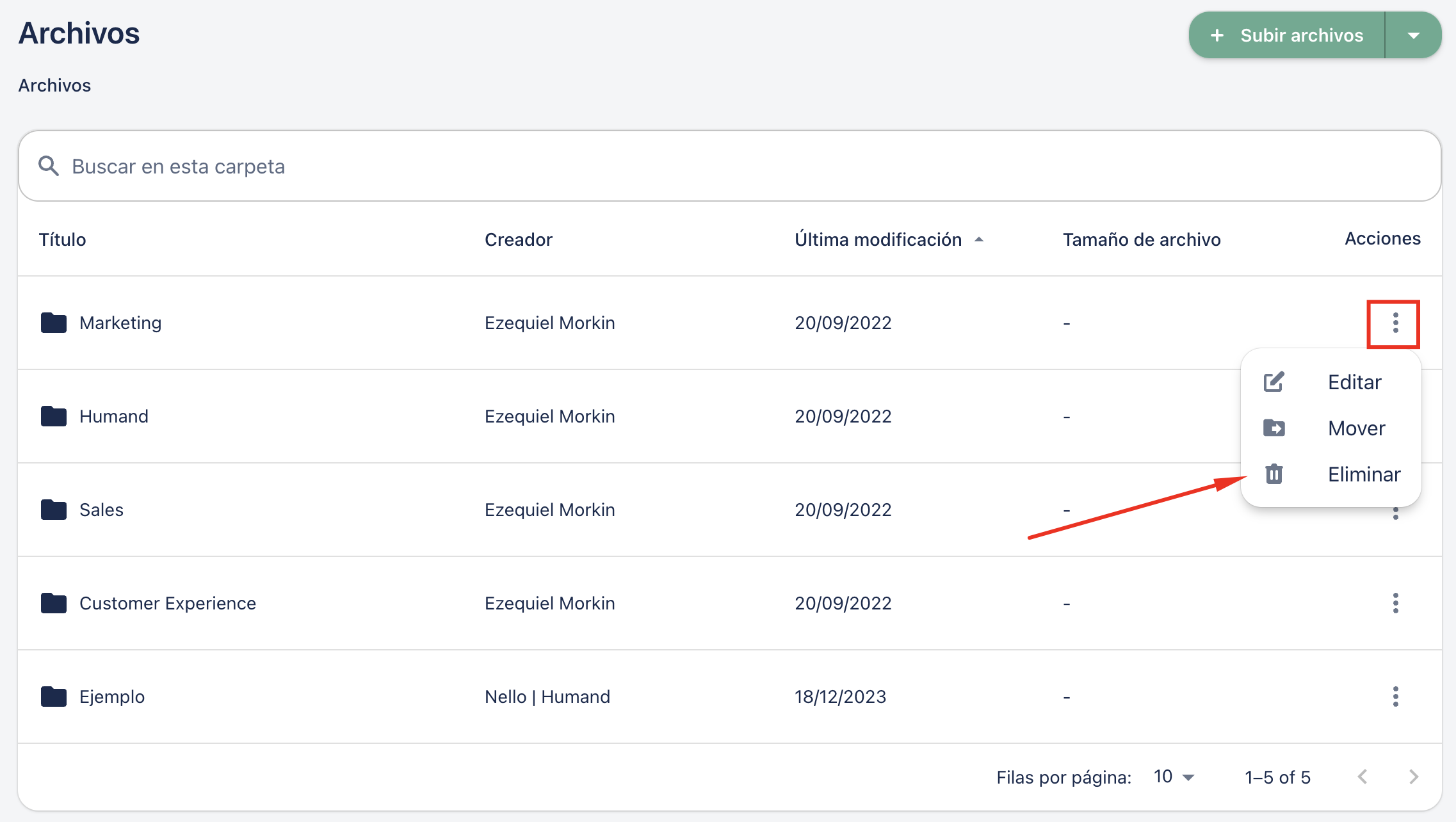 Desde aquí también puedes editar un archivo y moverlo a otra carpeta seleccionando "Editar" o "Mover".