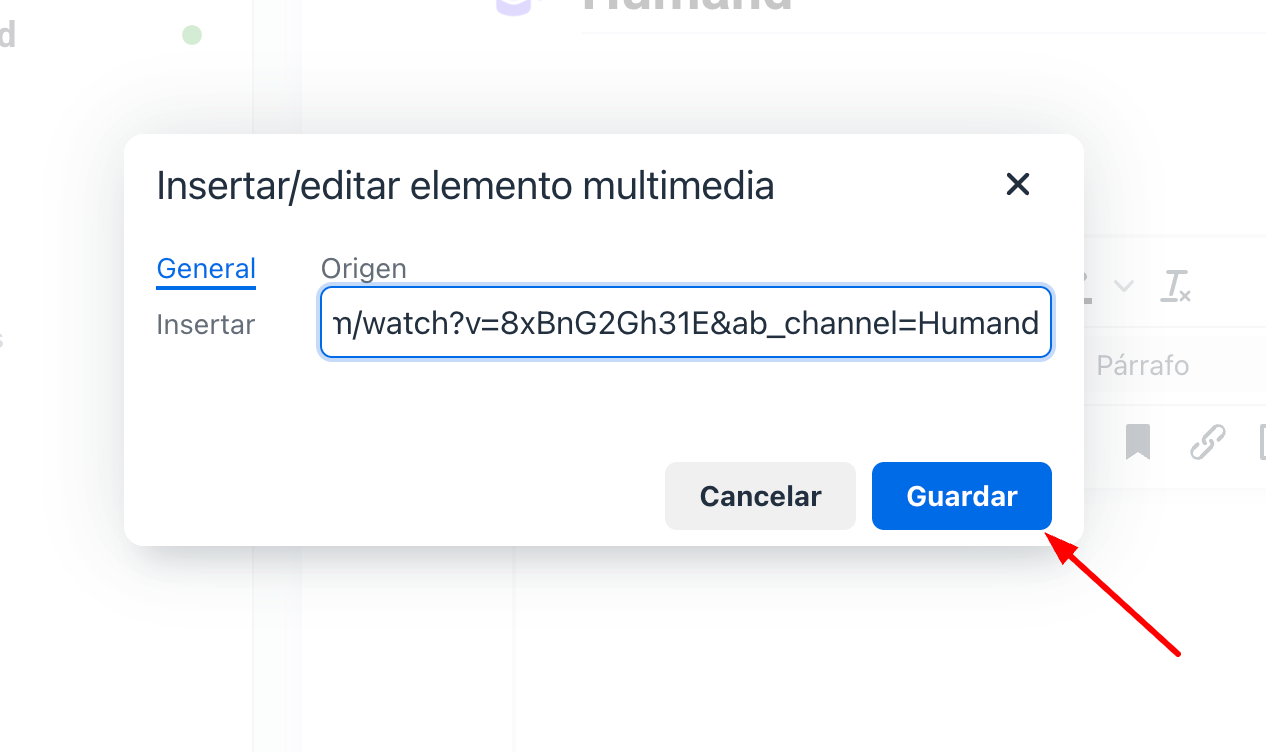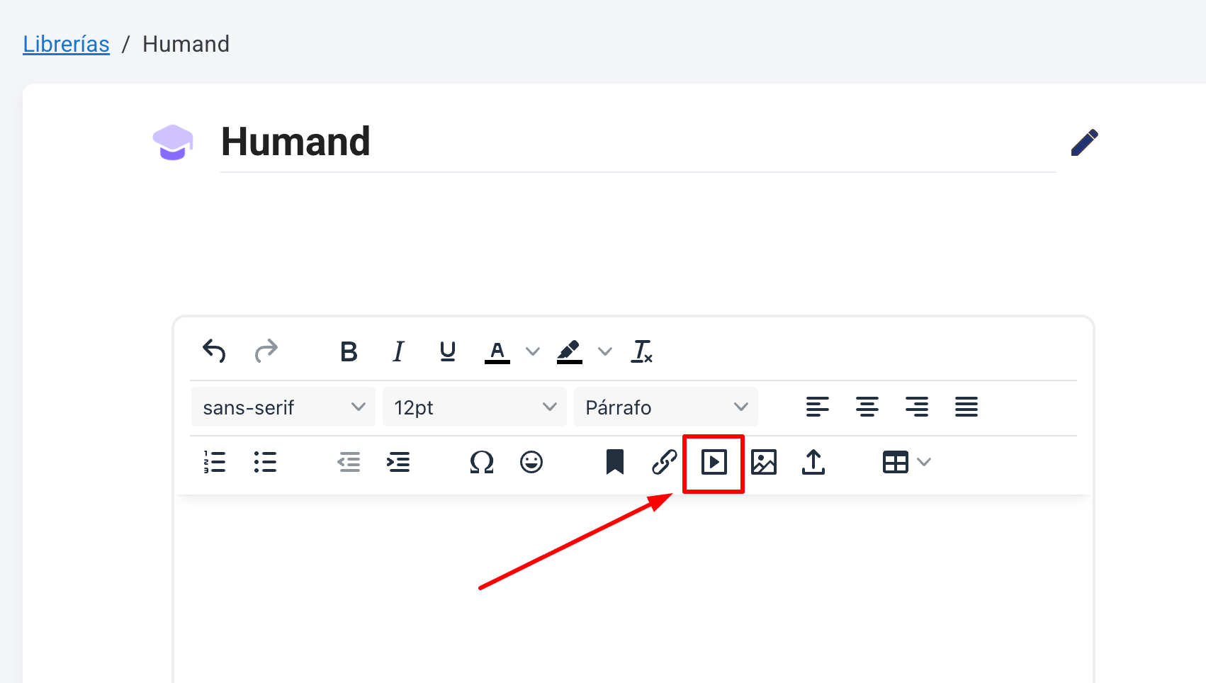 Desde el botón de "Insertar multimedia" podrás embeber videos.