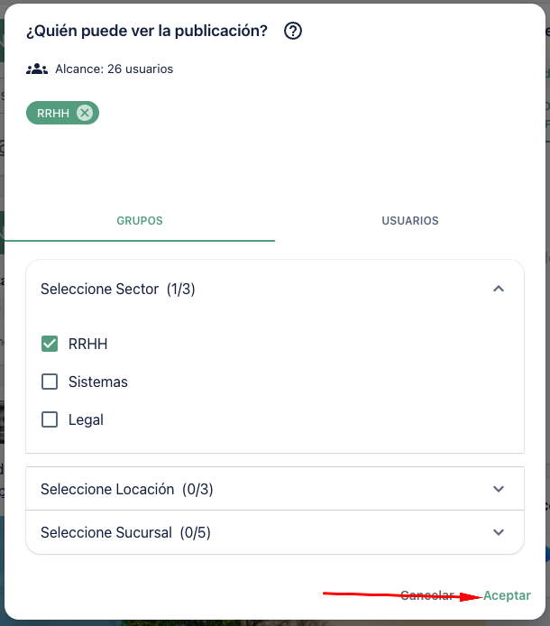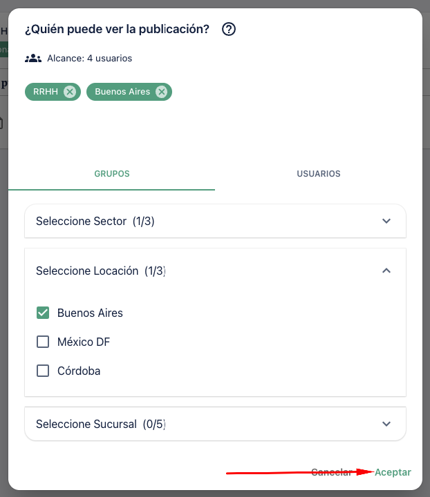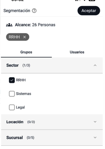 3. Desde Grupos, elige las segmentaciones a las cuales deseas segmentar la publicación y haz clic en Aceptar
