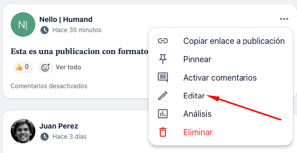 1. Sobre el post que editar la segmentación, pulsa en las opciones avanzadas (⋯)