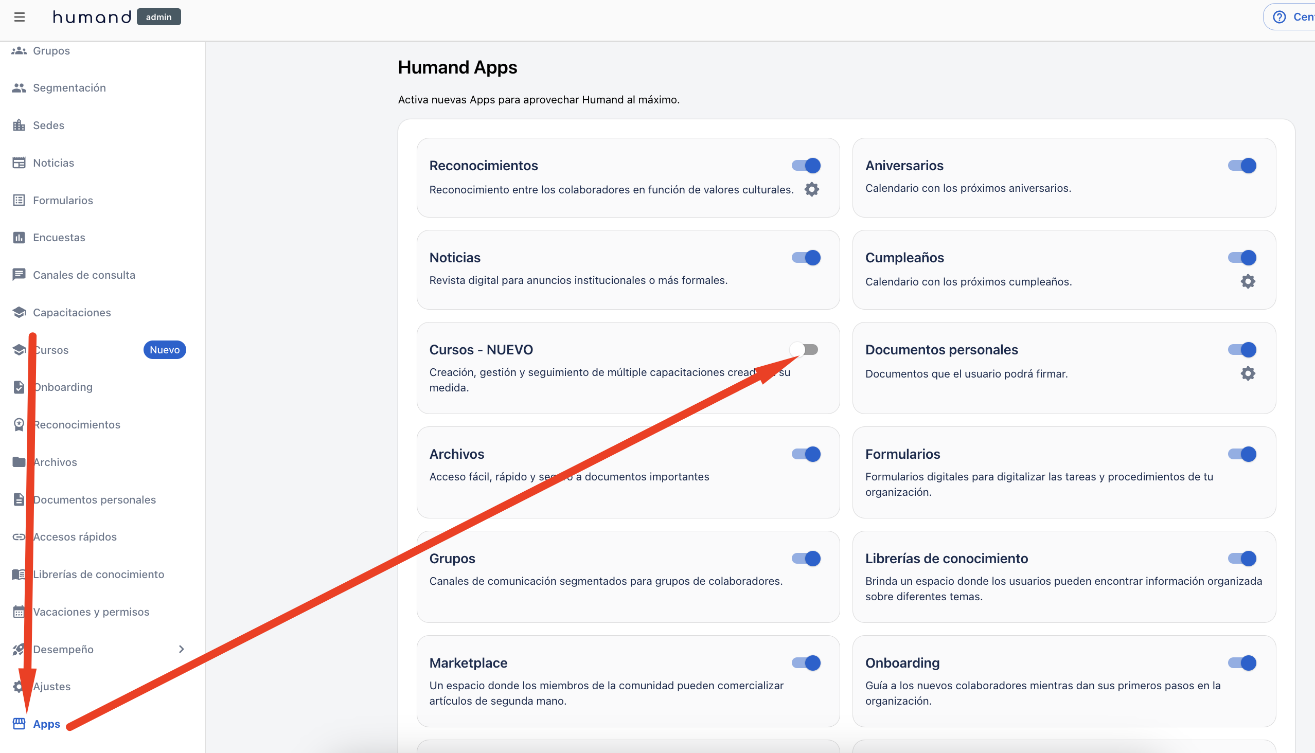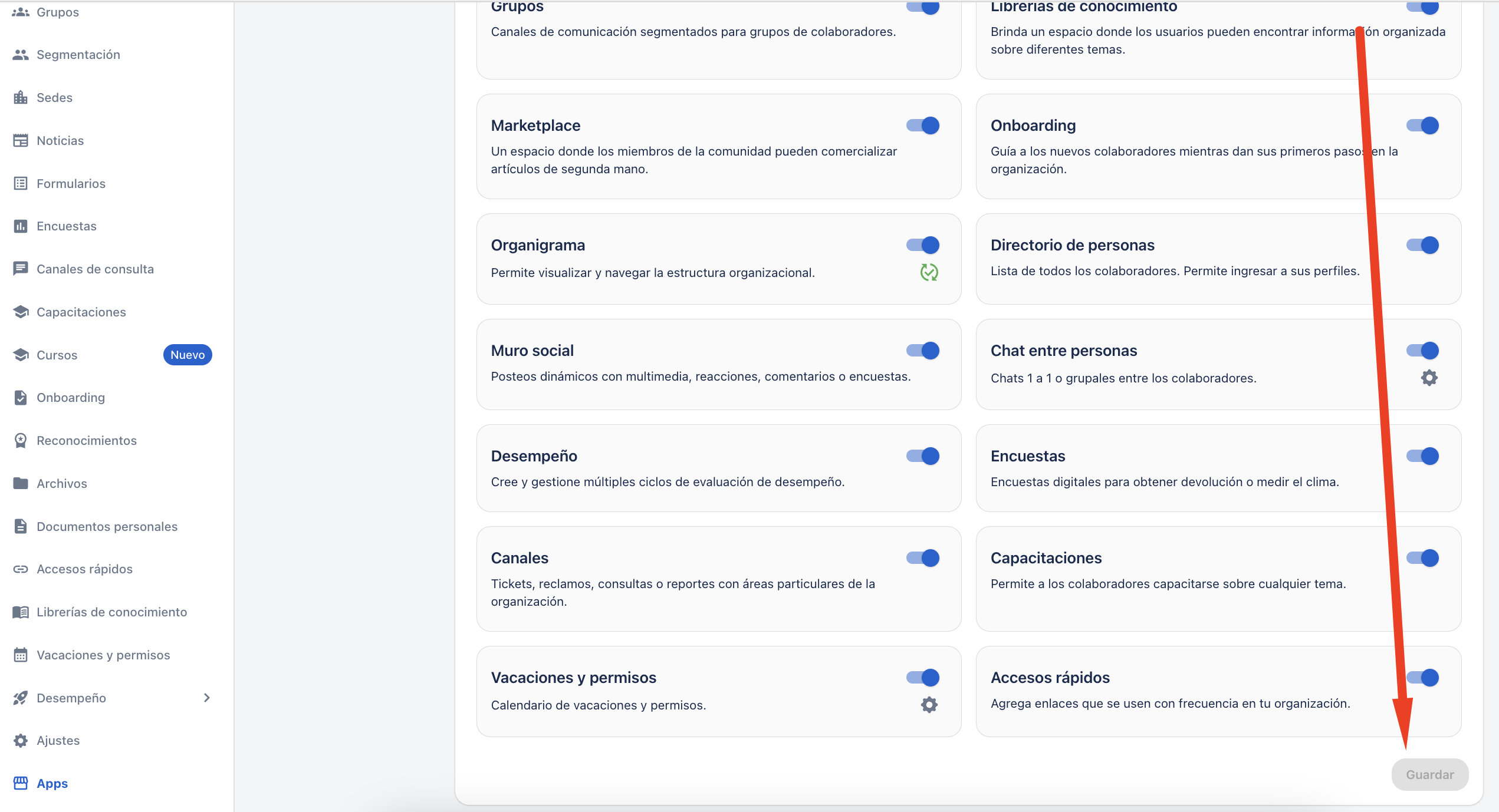 Para hacer visible el módulo de Cursos y que tus colaboradores puedan visualizar los cursos creados debes seguir pasos: