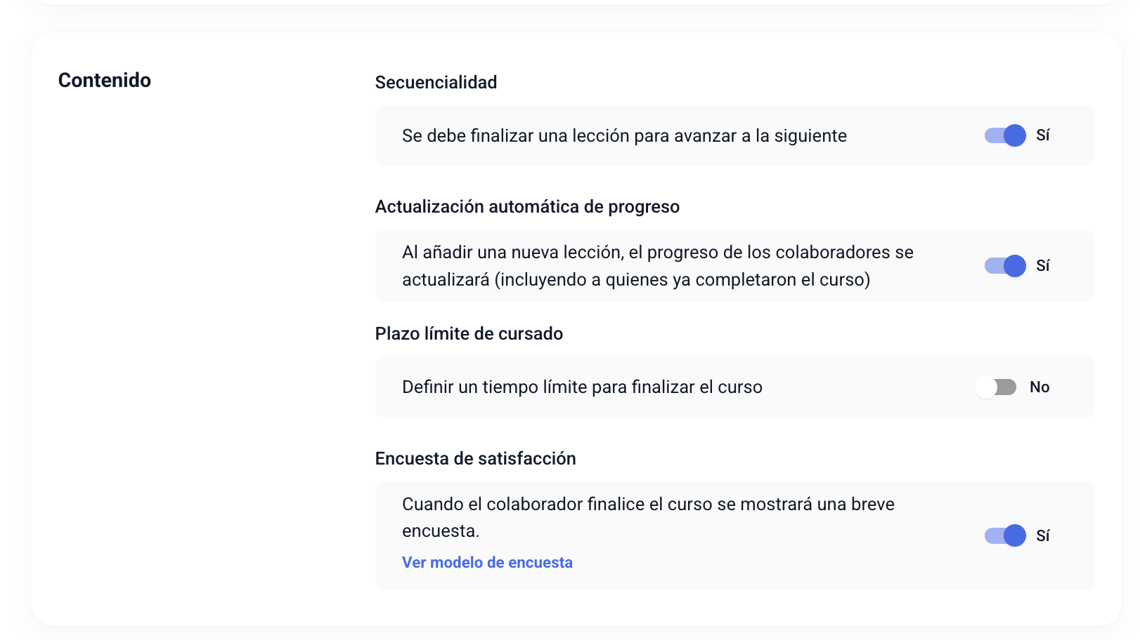 - Actualización automática de progreso: Activarlo hace que al añadir una nueva lección, el progreso de los colaboradores se actualizará (incluyendo a quienes ya completaron el curso).