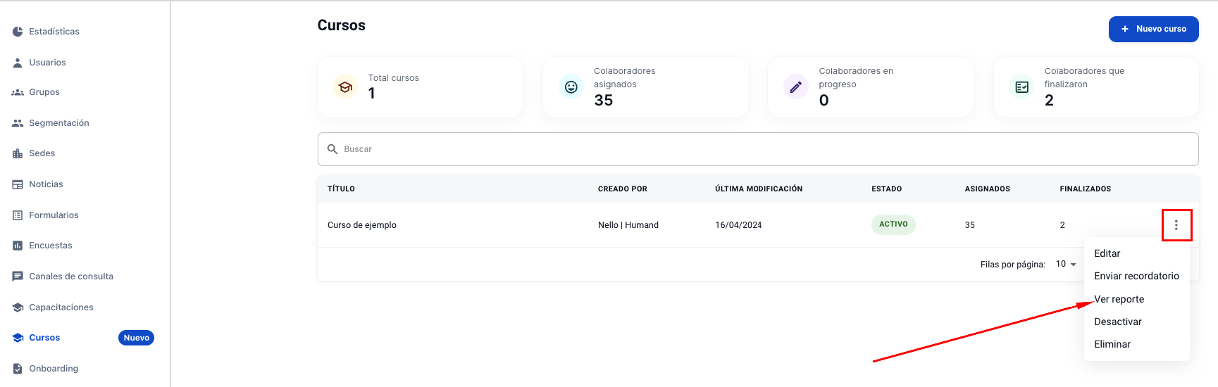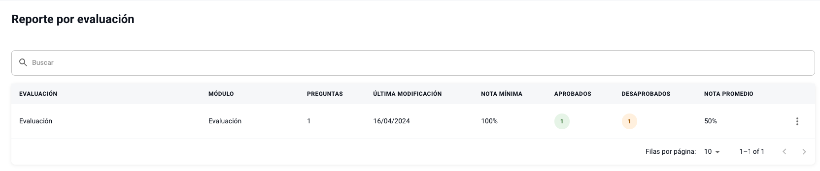 En el caso de que un curso tenga evaluaciones dentro, puedes ver un reporte del estado y resultados de esas evaluaciones. El reporte por evaluación te permite conocer: