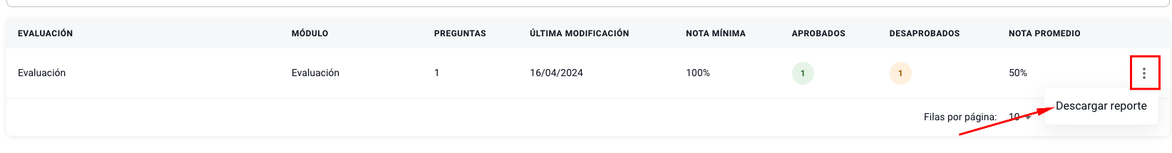 Si precisas descargar un reporte de los resultados de cada evaluación, debes hacer clic sobre los 3 puntos (⦙)