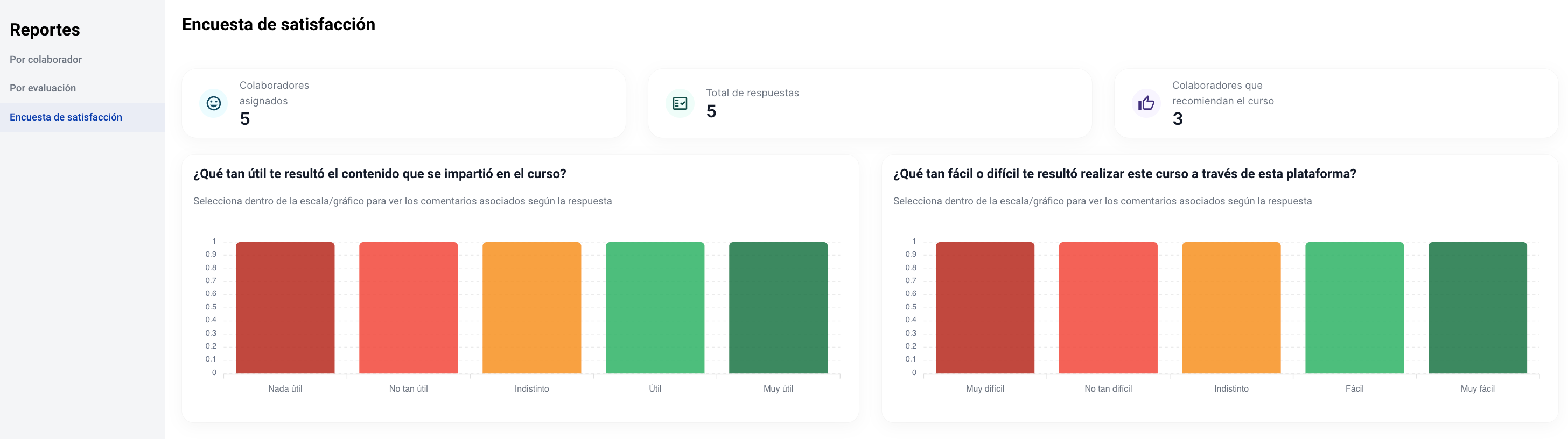 3. Y ahora puedes ver los tres tipos de informes disponibles: reportes por colaboradores, reportes por evaluación, y reportes de las encuestas de satisfacción.