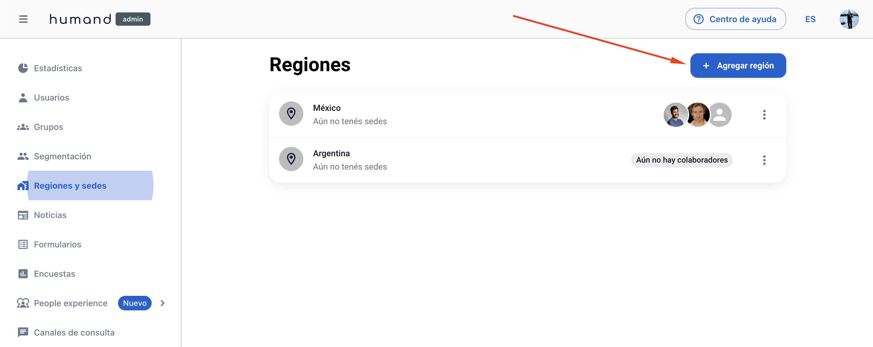 3. Clic en + Agregar región.