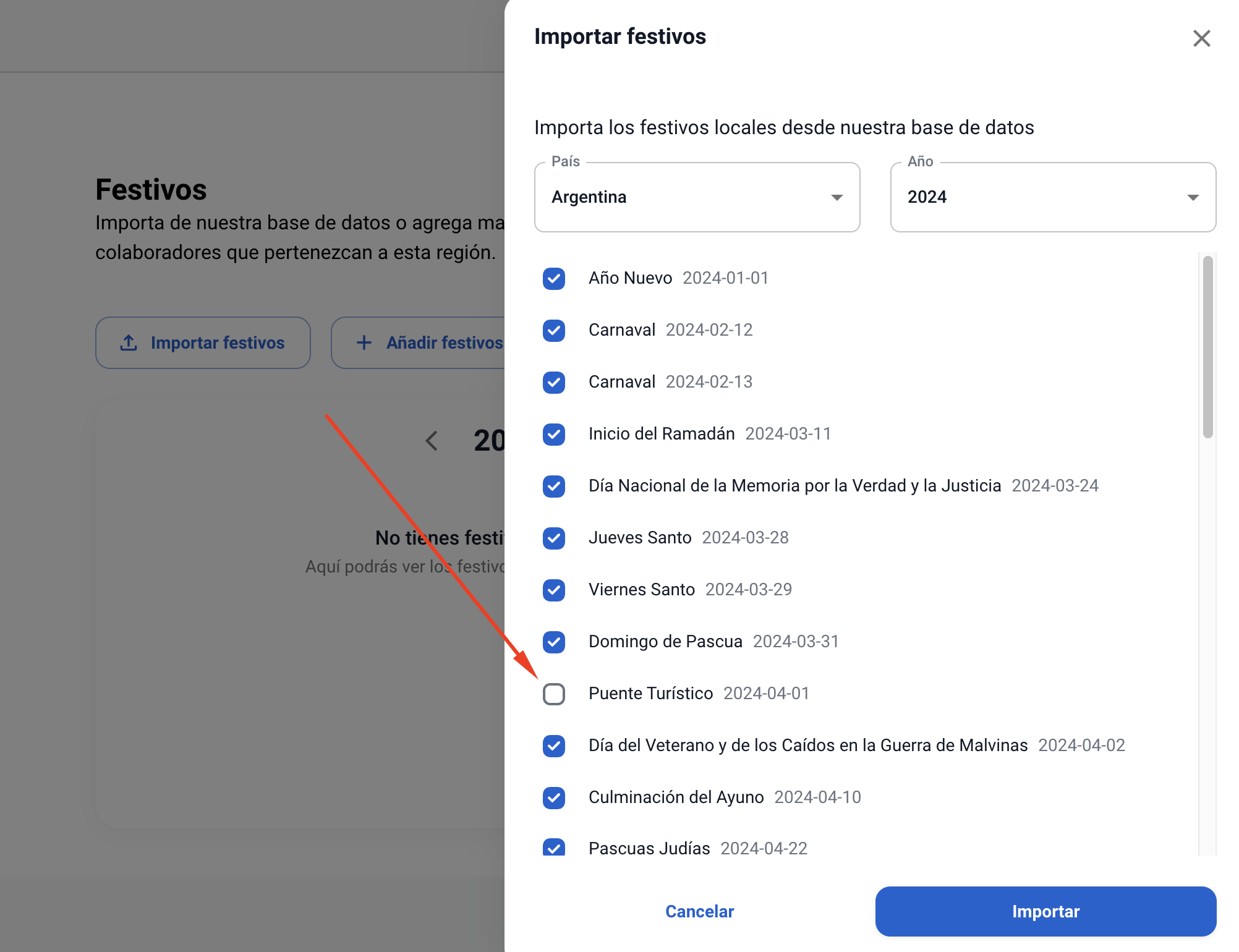 Eligiendo el país y el año, puede importar los días festivos oficiales desde nuestra base de datos. Si no deseas contar con algún día festivo de los que le aparecen en la lista, sólo debes asegurarte que la casilla no se encuentre seleccionada.