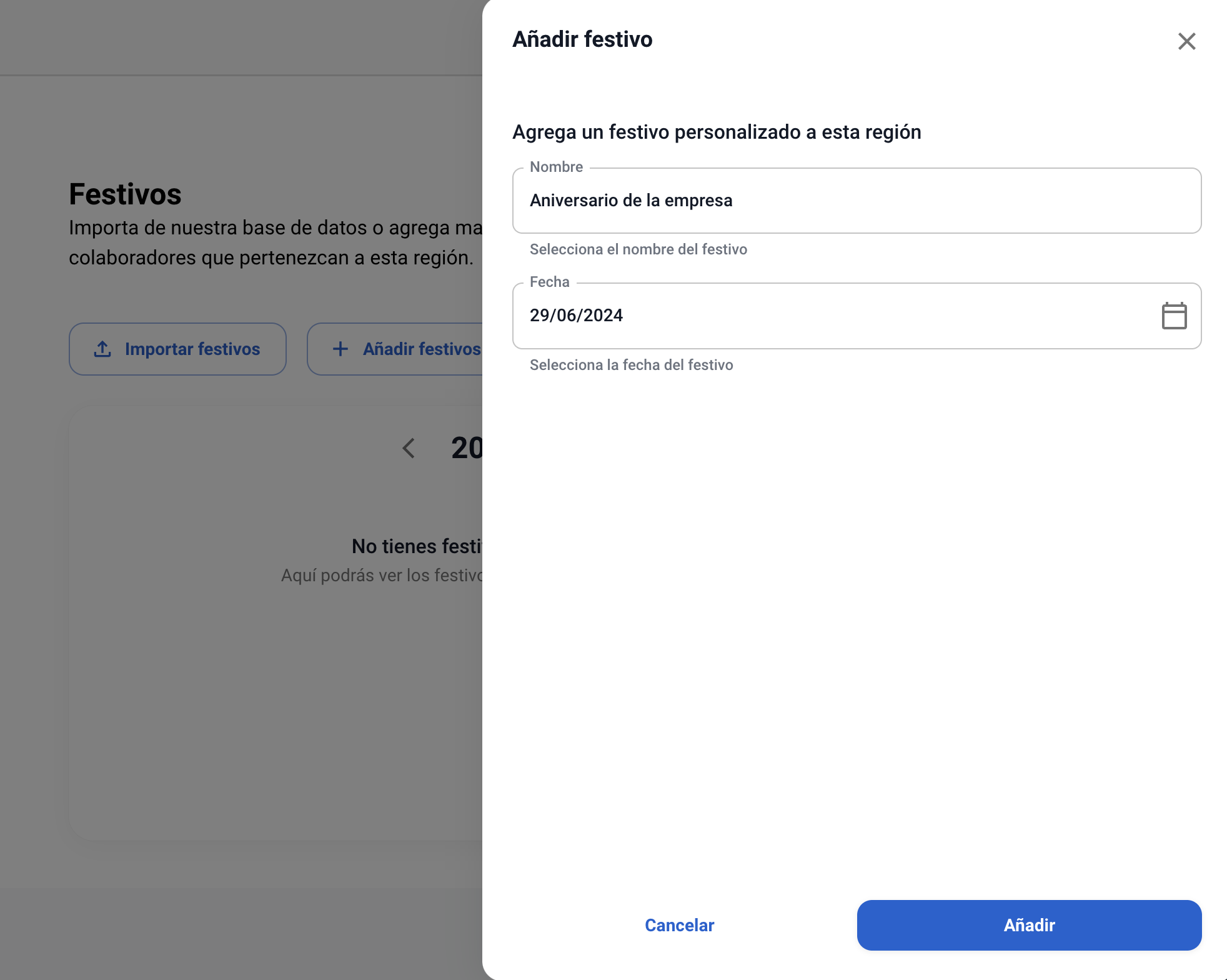 Desde aquí puedes cargar un día festivo manualmente. Para ello debes asignarle un nombre y seleccionar en el calendario la fecha en la que se celebra.