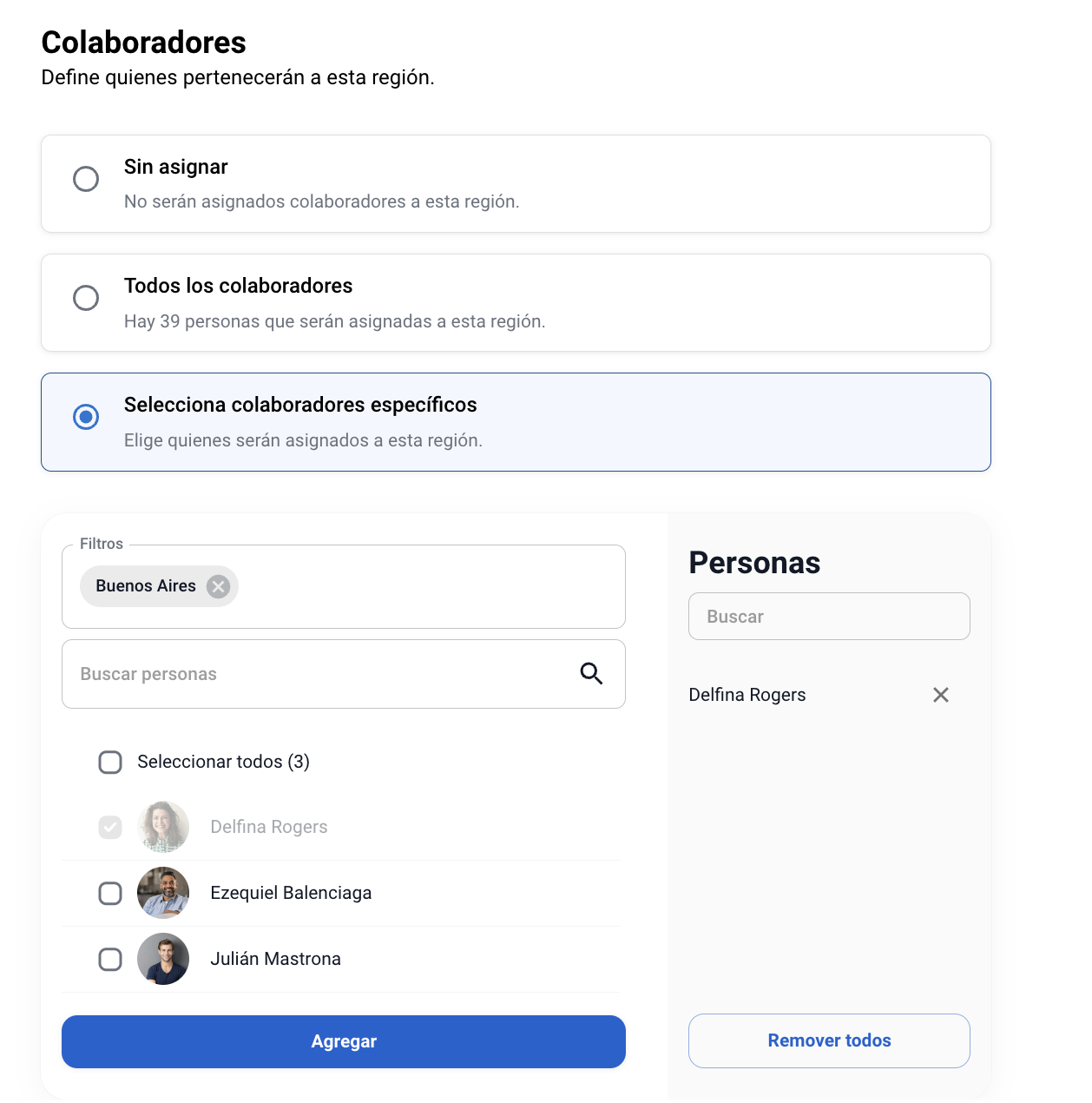 Finalmente asigna a la nueva sede las personas que formarán parte de ella. Puedes añadirlas buscando individualmente a cada colaborador, o utilizando las segmentaciones creadas en tu comunidad (filtros).