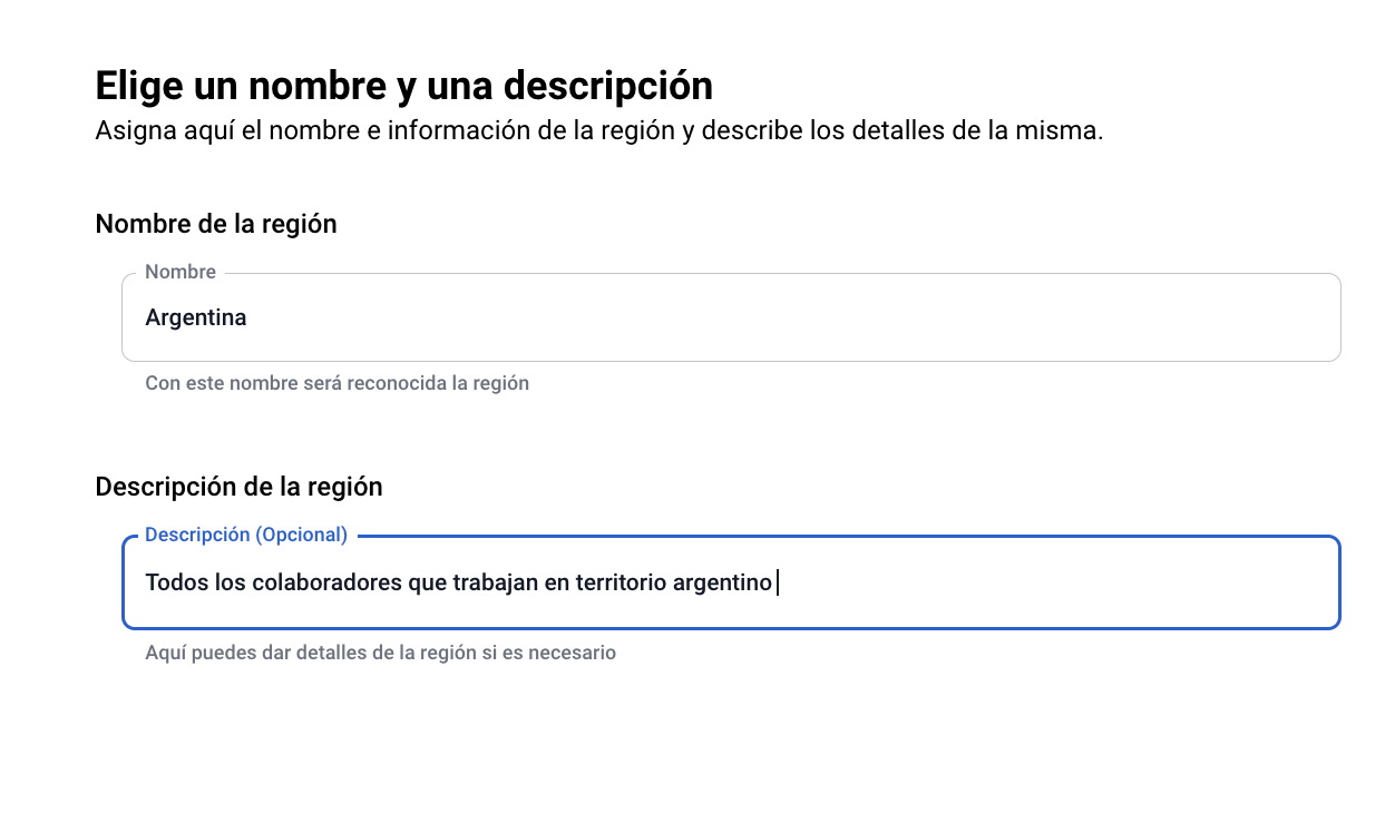Ingresa el nombre y la descripción de la nueva región.