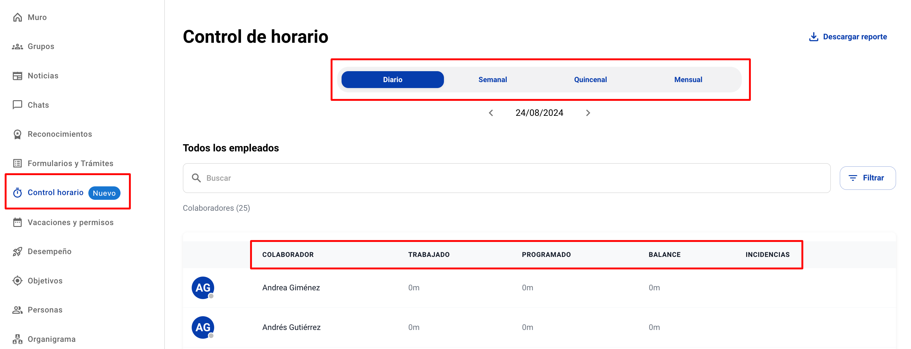 2. Aquí podrás visualizar los registros de horario de tus colaboradores, divididos por día, semana, quincena y mes.
