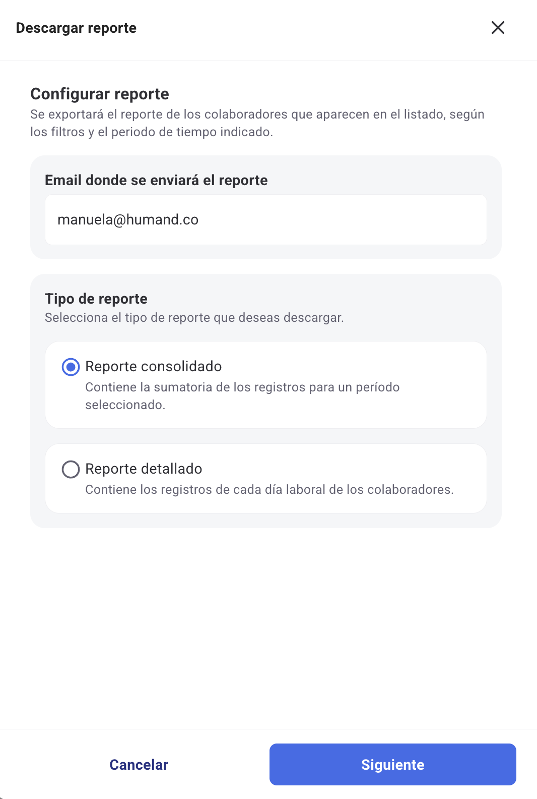 - Reporte detallado: contiene los registros de cada día laboral de los colaboradores.