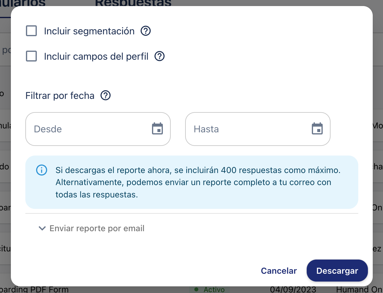 Si descargas el reporte en esta sección se incluirán 400 respuestas como máximo. Alternativamente, puedes elegir la opción de enviar un reporte completo a tu correo con todas las respuestas.