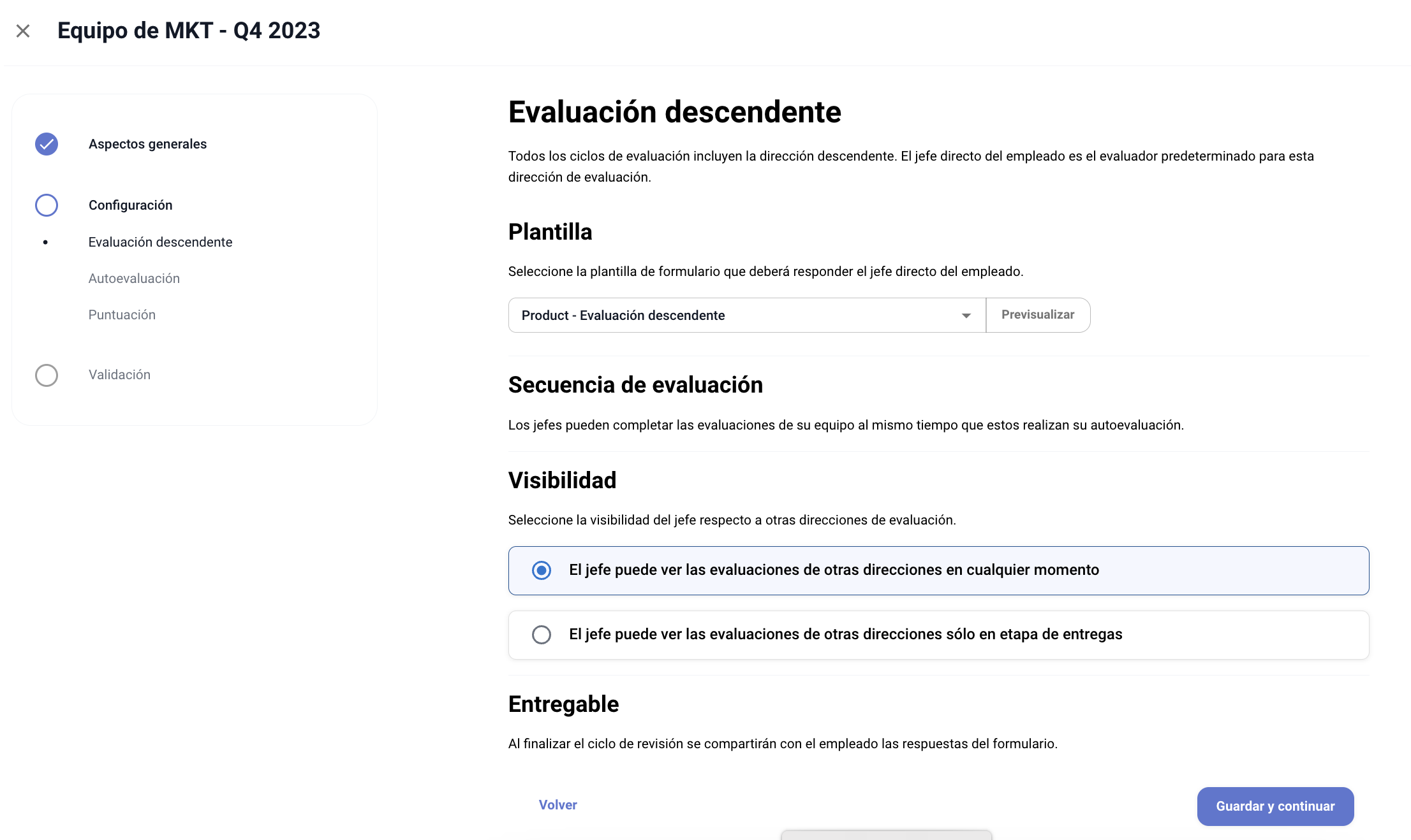 2. Seleccionar la visibilidad del jefe respecto a otras direcciones de evaluación. Puedes establecer que el jefe pueda ver las evaluaciones de otras direcciones en cualquier momento o que el jefe pueda ver las evaluaciones de otras direcciones sólo en etapa de entregas. -