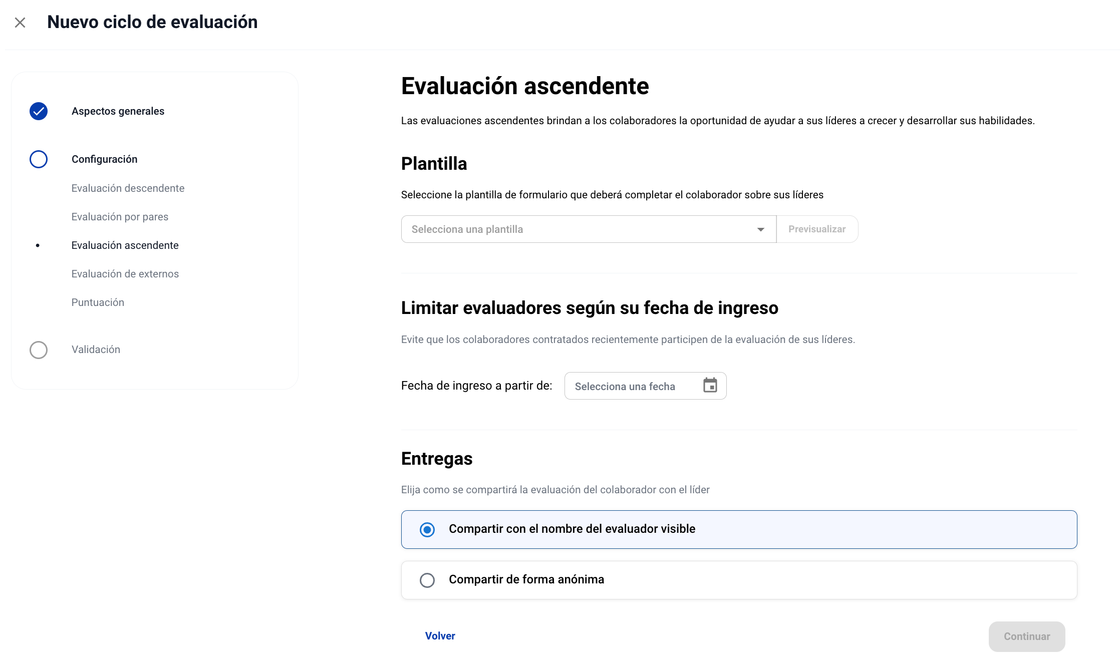Desde aquí tendrás que elegir cómo se compartirá la evaluación del colaborador con el líder: