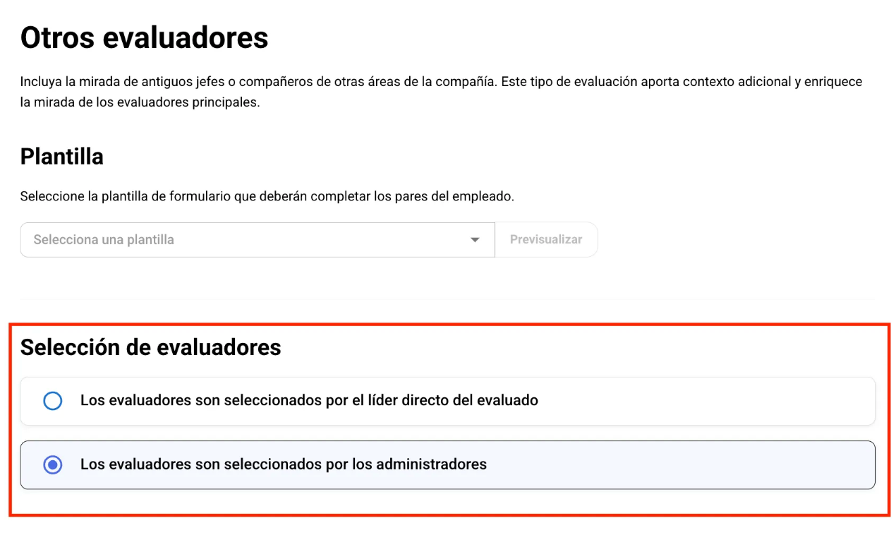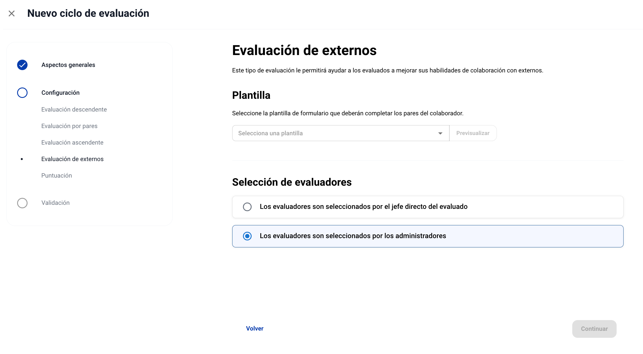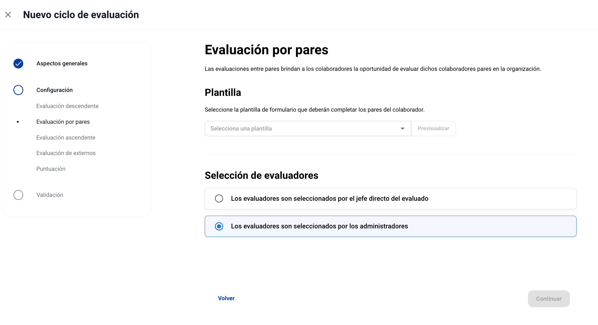 Desde aquí tendrás que configurar cómo será la selección de evaluadores: