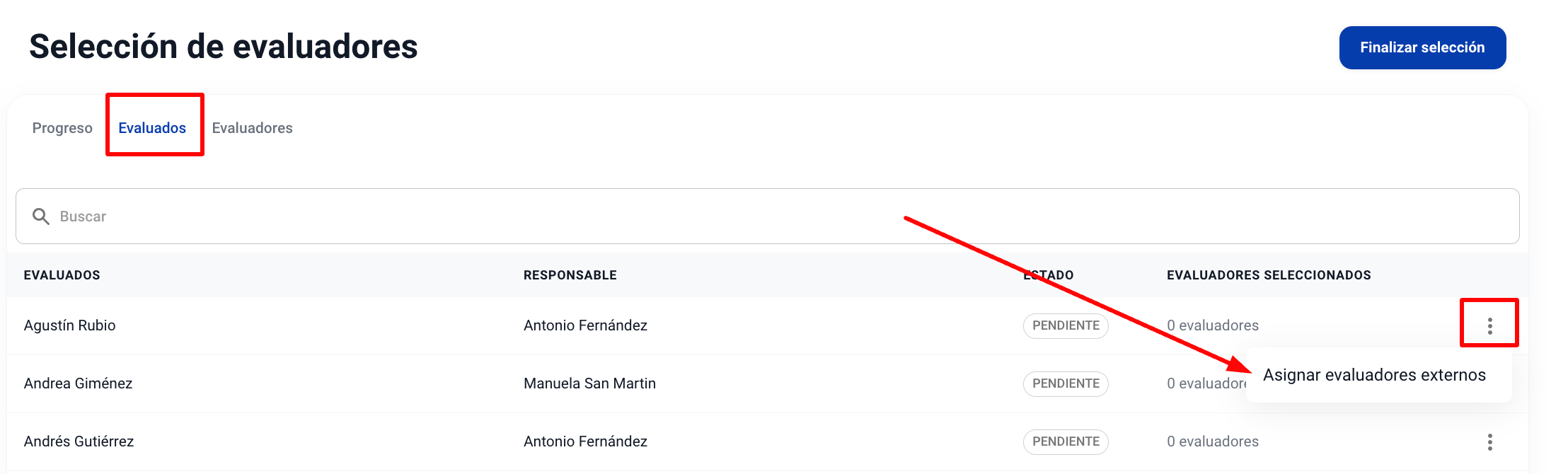 Luego de crear el ciclo de evaluación, se deberá realizar la selección de evaluadores.