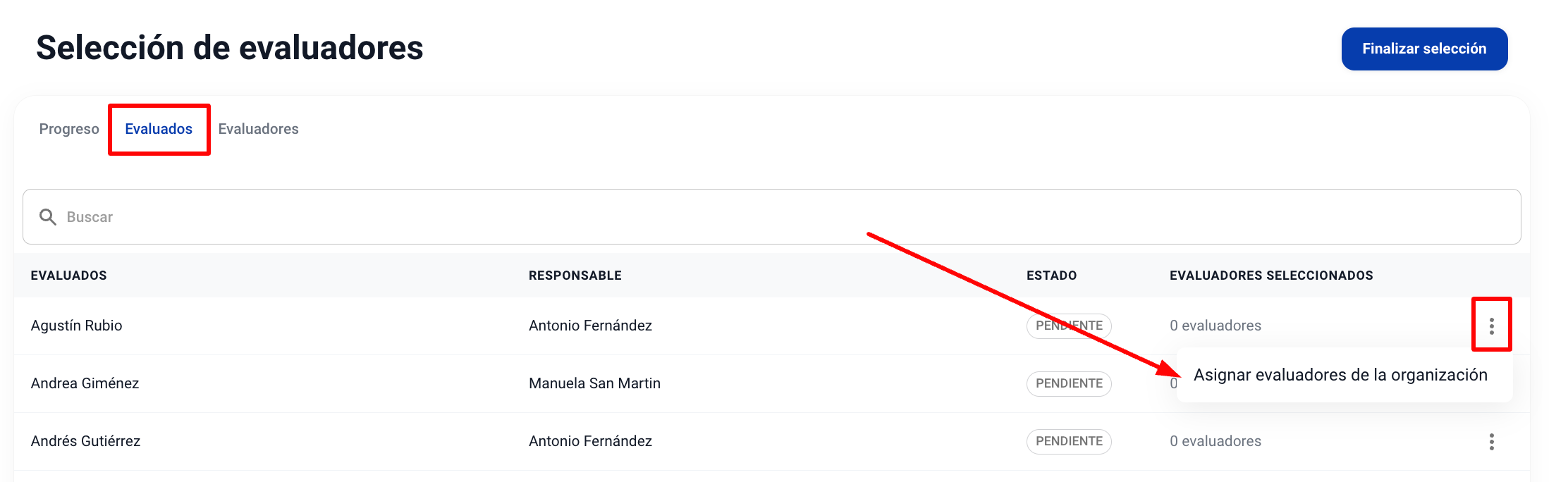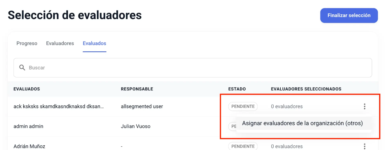 Una vez en la configuración de la selección, desde la pestaña de "Evaluados" podemos realizar la asignación de quién evaluará a cada usuario.