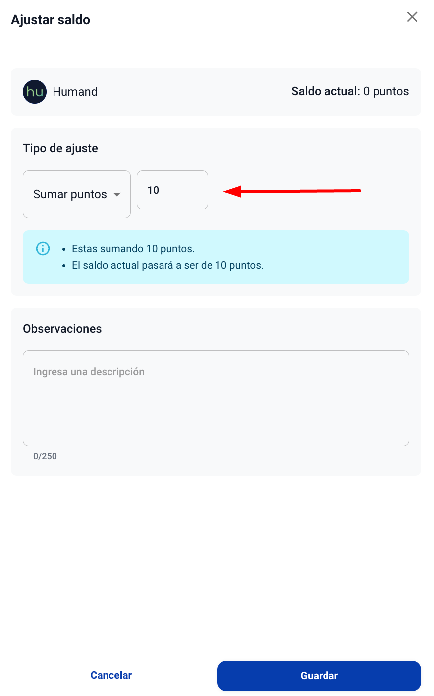4. A continuación, selecciona si deseas sumar o restar puntos al saldo y cuantos puntos. Opcionalmente puedes agregar una descripción, y luego debes hacer click en Guardar.