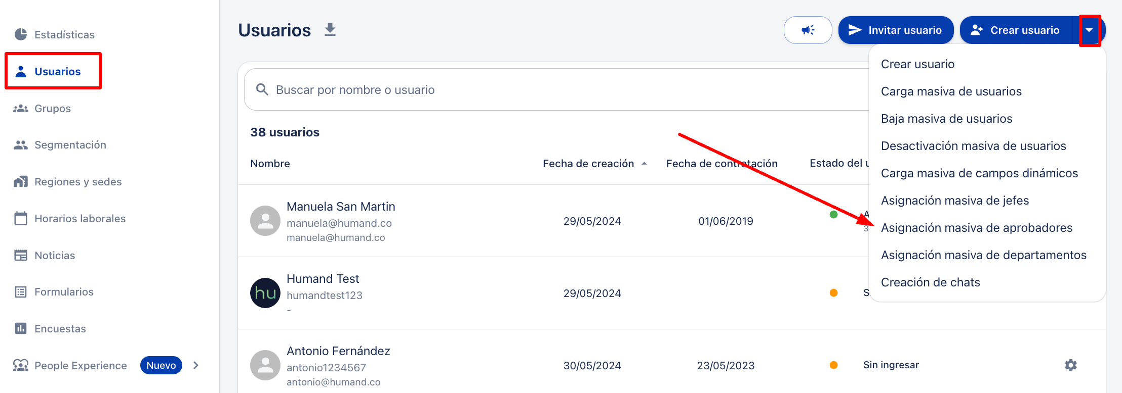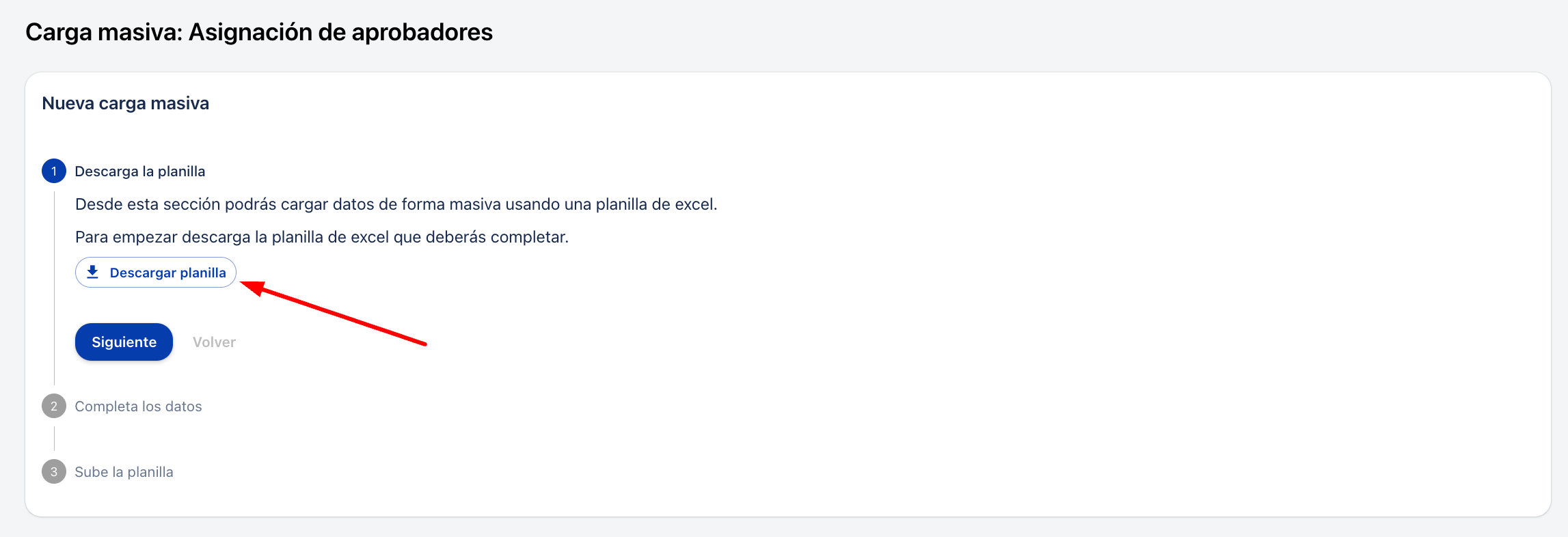 Para realizar una asignación masiva de aprobadores de los usuarios, debes seguir estos pasos: