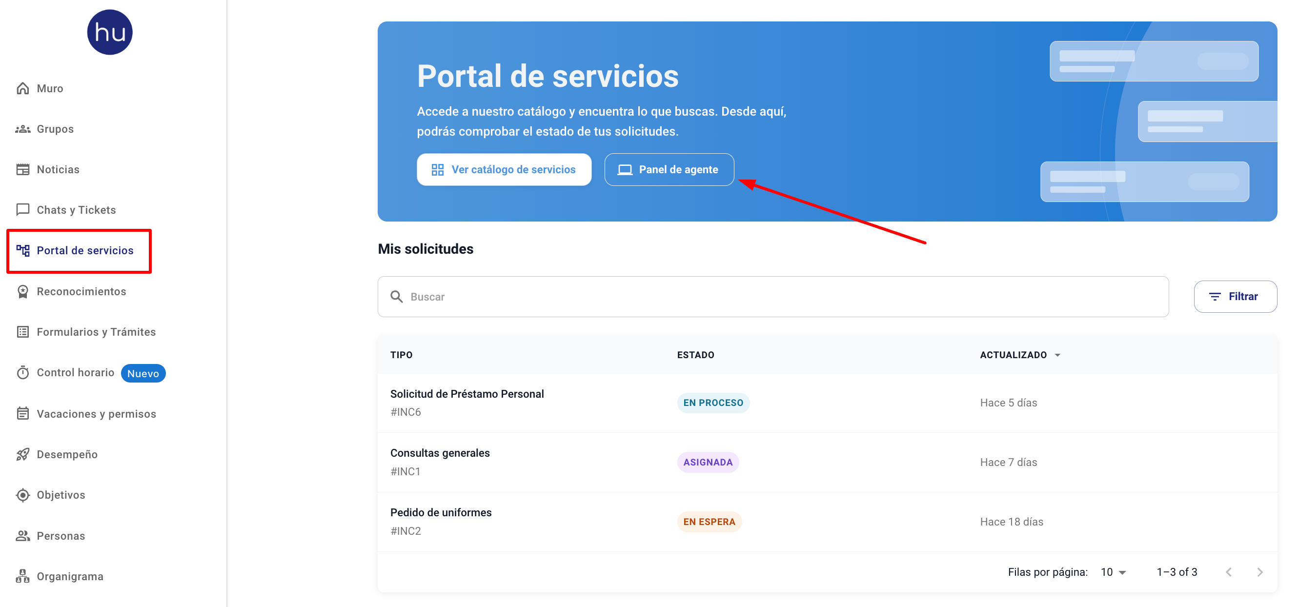 2. Ir a la sección de Portal de Servicios y hacer click en el botón de "Panel de agente".3. Aquí podrás visualizar el listado de solicitudes. Haz click en la solicitud que deseas re-asignar.