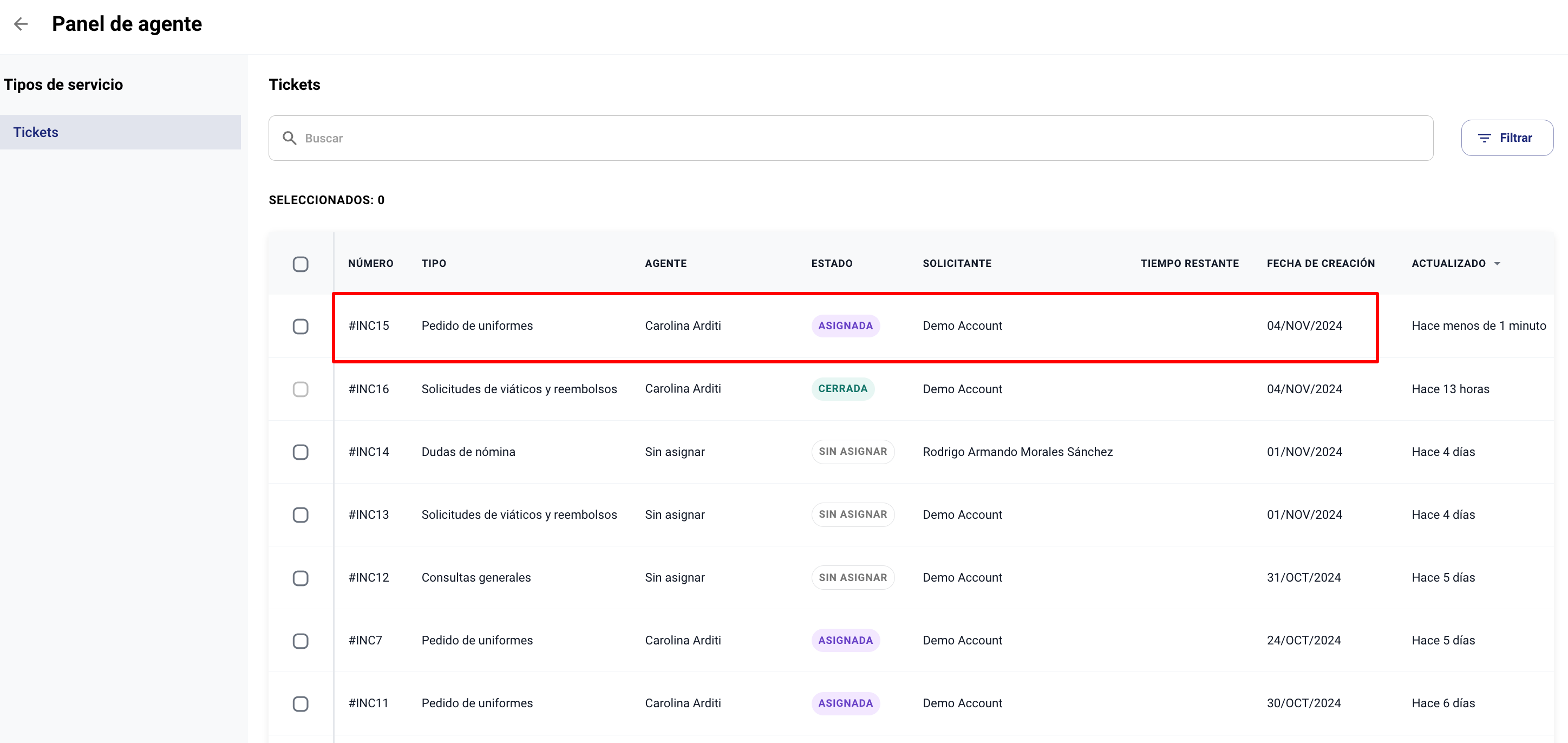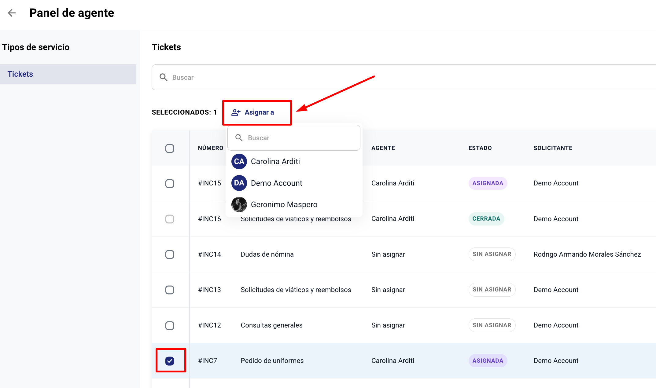 7. También puedes re-asignar solicitudes desde el Panel de Agente, seleccionando el ticket y haciendo click en "Asignar a".