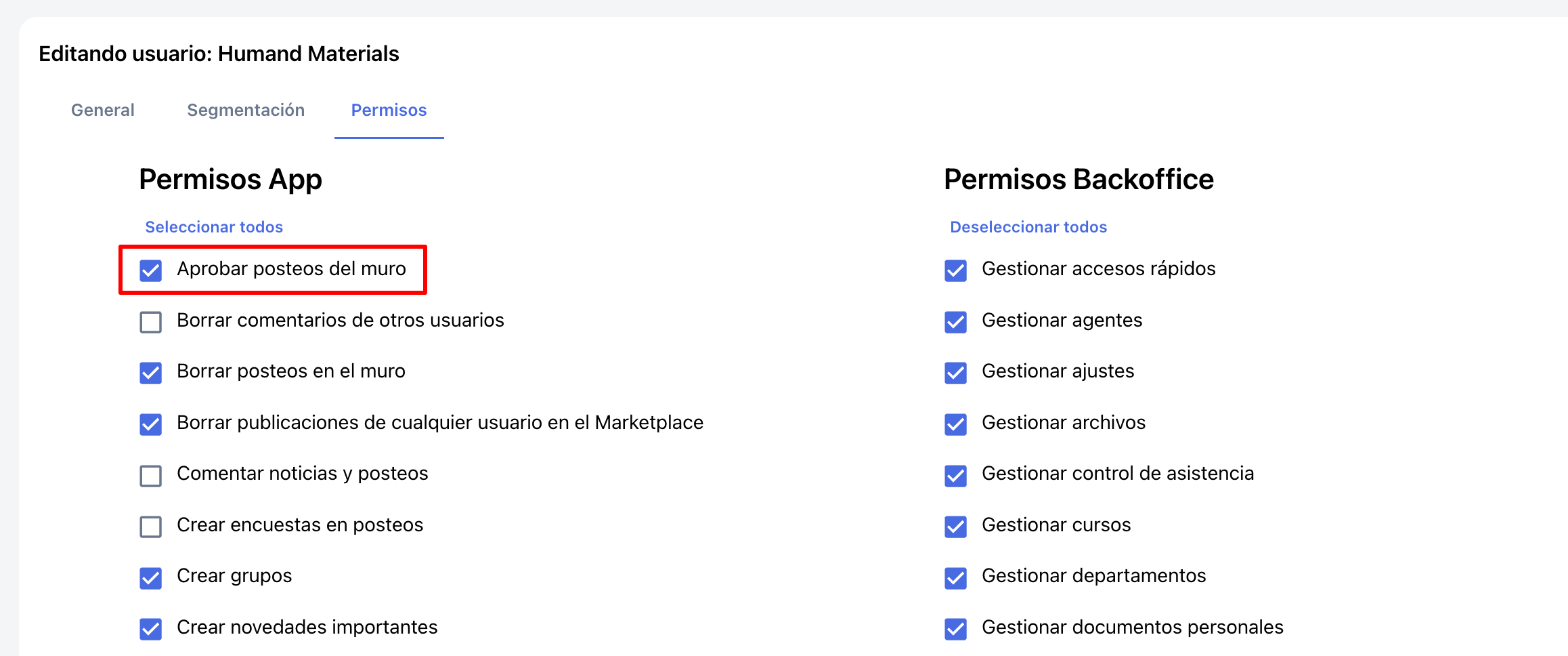 Tener en cuenta que para aprobar/rechazar posteos el usuario debe contar con el permiso de "Aprobar posteos en el muro".