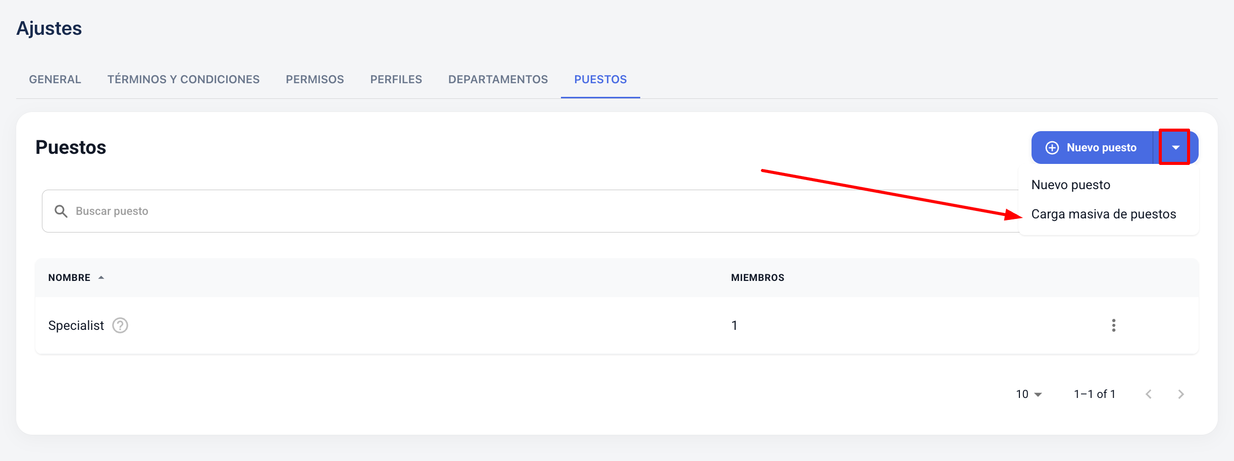 4. Desplegar el botón de "Nuevo puesto +" y seleccionar la opción de "Carga masiva de puestos".