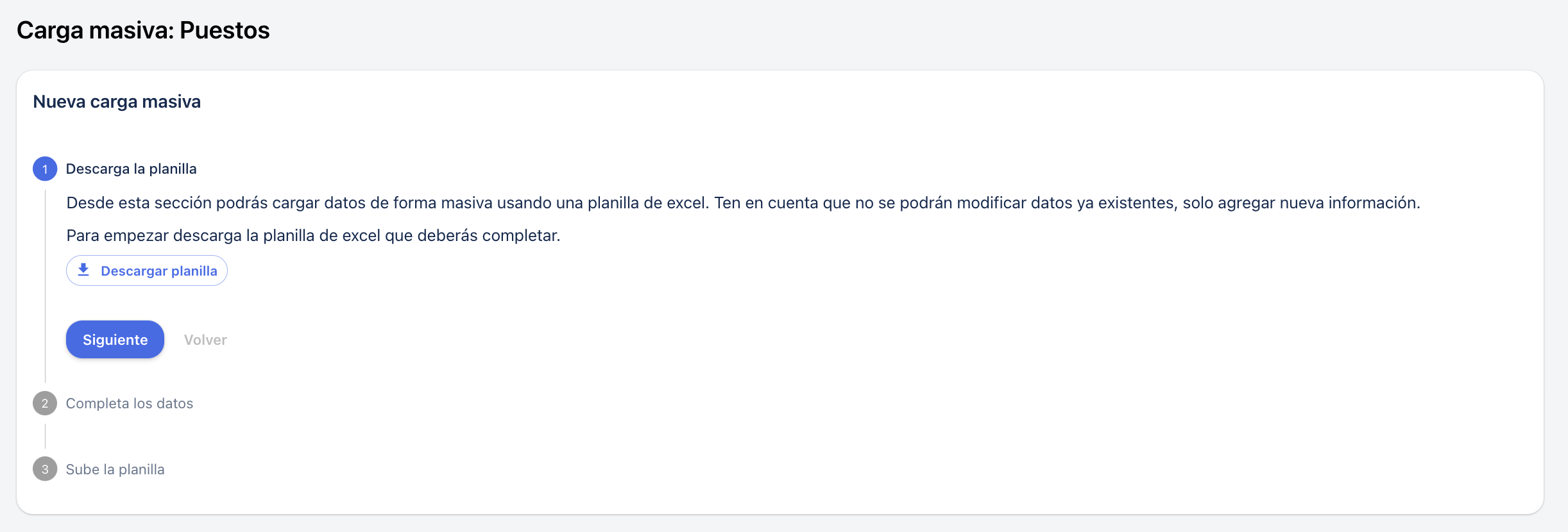 Existe la posibilidad de realizar una carga masiva de puestos a fin de no tener que hacerlo individualmente, uno por uno. Para realizar esto debes seguir estos pasos: