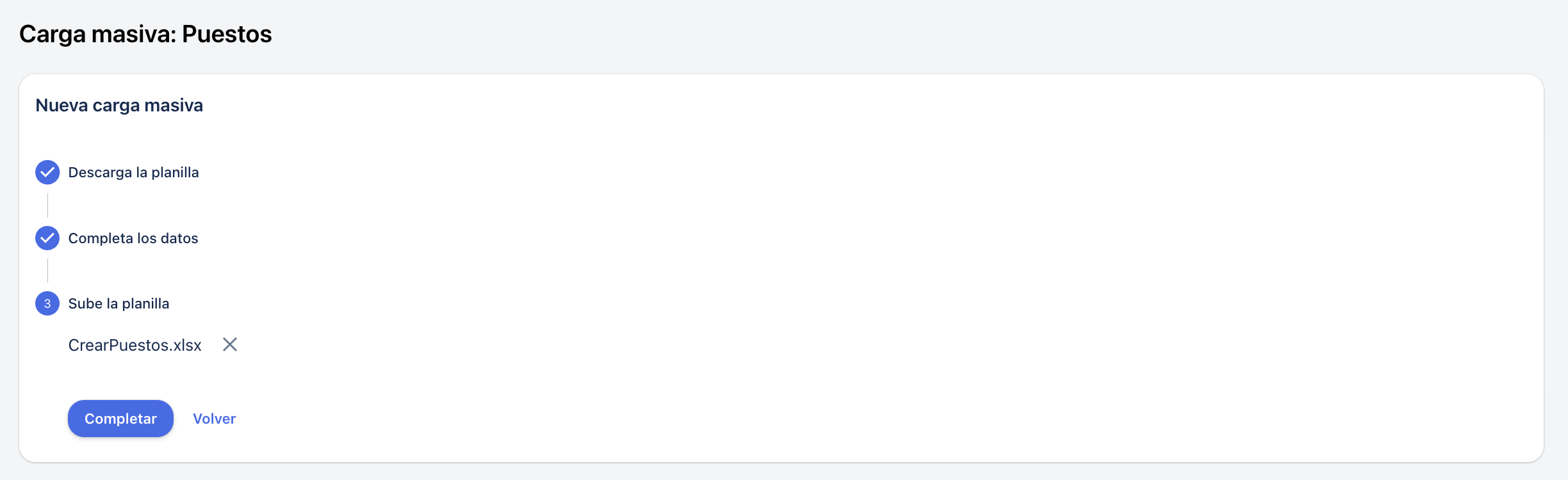 7. ¡Y listo! Ya realizaste una carga masiva de puestos. En el Historial verás el Estado de la baja masiva. Los posibles estados son: Error, En proceso, Parcial, Completado.