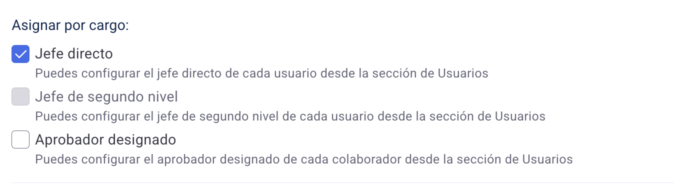 En caso de haber configurado alguna de estas opciones debemos asegurarnos de que todos los usuarios tengan asignados sus respectivos jefes directos, jefes de segundo nivel o aprobadores designados. Para más detalle sobre cómo realizar estas asignaciones pueden consultas los siguientes artículos: