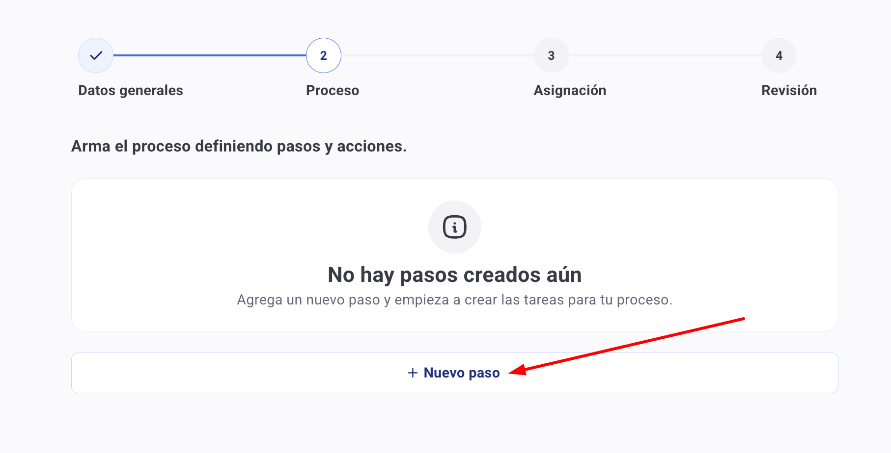 Los pasos serán agrupaciones de tareas que se dispararán en un momento elegido por el usuario administrador. Para crear un nuevo paso haz click en "+ Nuevo paso".
