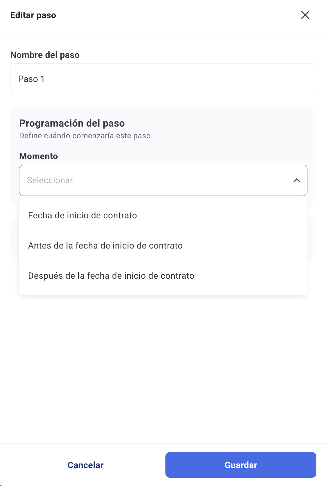 Cada paso será un conjunto de acciones y tareas que se dispararán en un momento determinado. Dentro de esta pestaña podrás indicar el nombre del paso y el momento en el cual quieres que comience el mismo, hay 3 opciones: