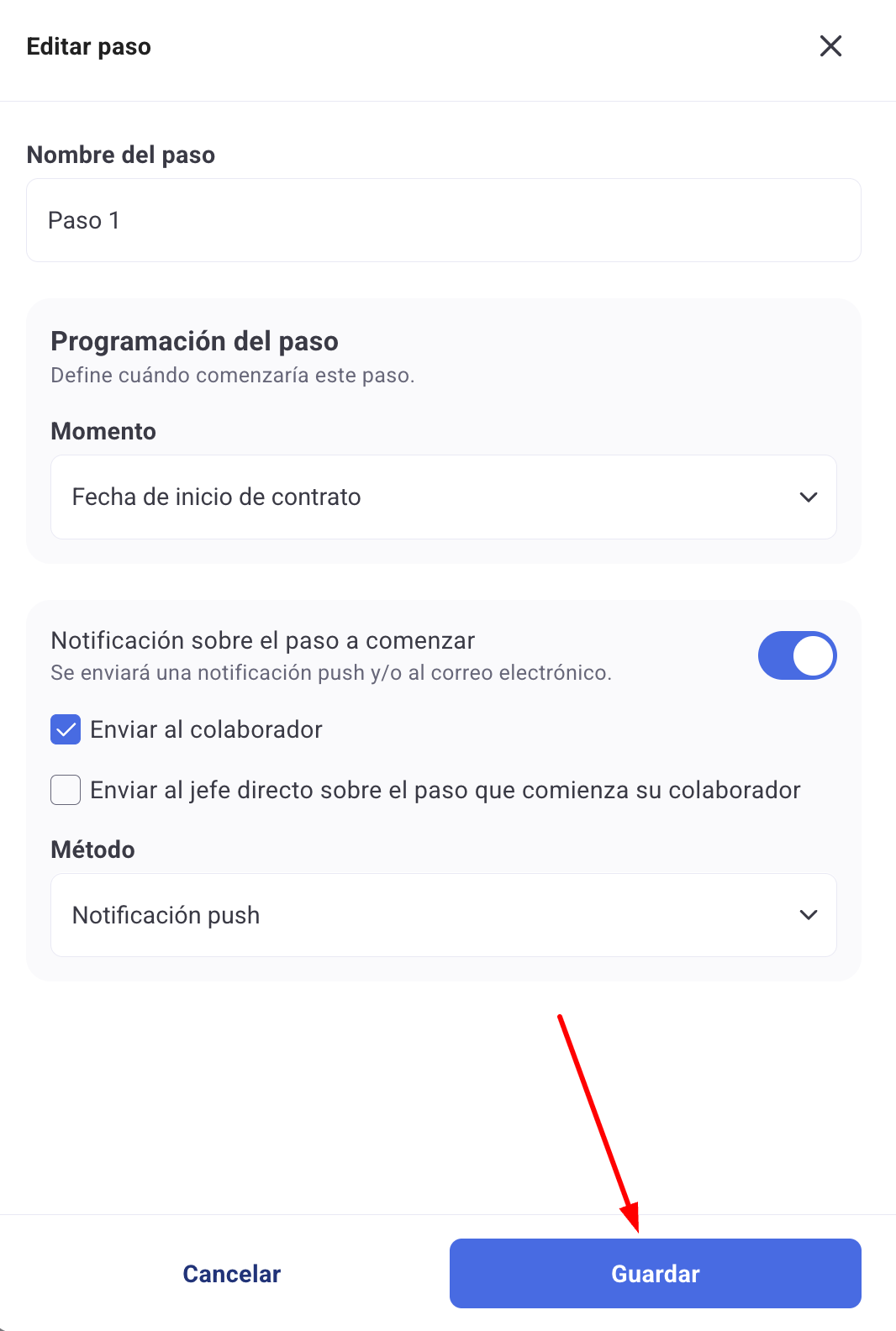 A su vez, se podrá activar el envío de notificación sobre el paso a comenzar a los colaboradores o jefes directos. Luego de haber configurado el paso, haz click en "Guardar" para finalizar la creación.