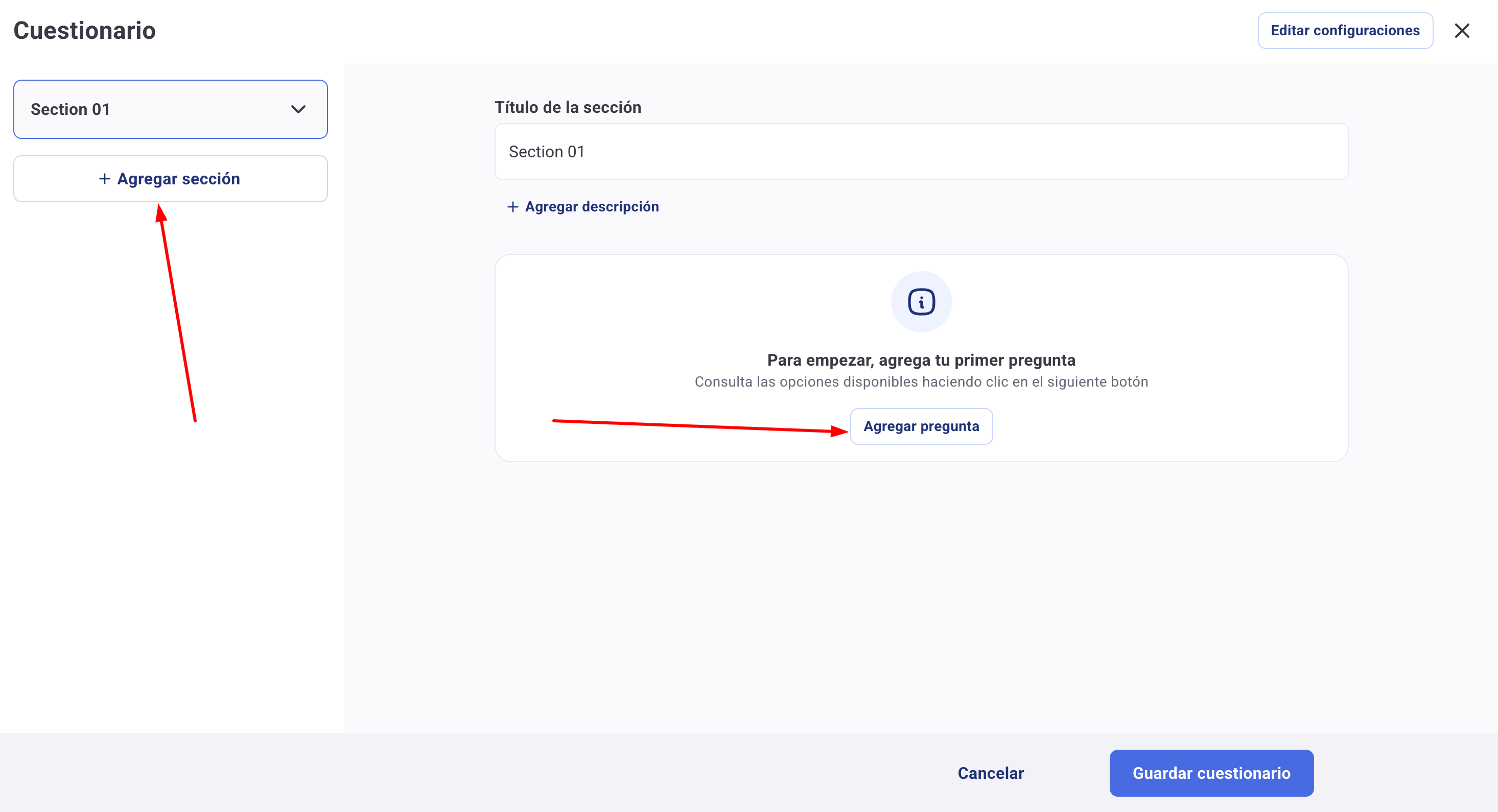 En el caso de crear un cuestionario, se abrirá una página donde podrás agregar preguntas y secciones dentro del mismo.