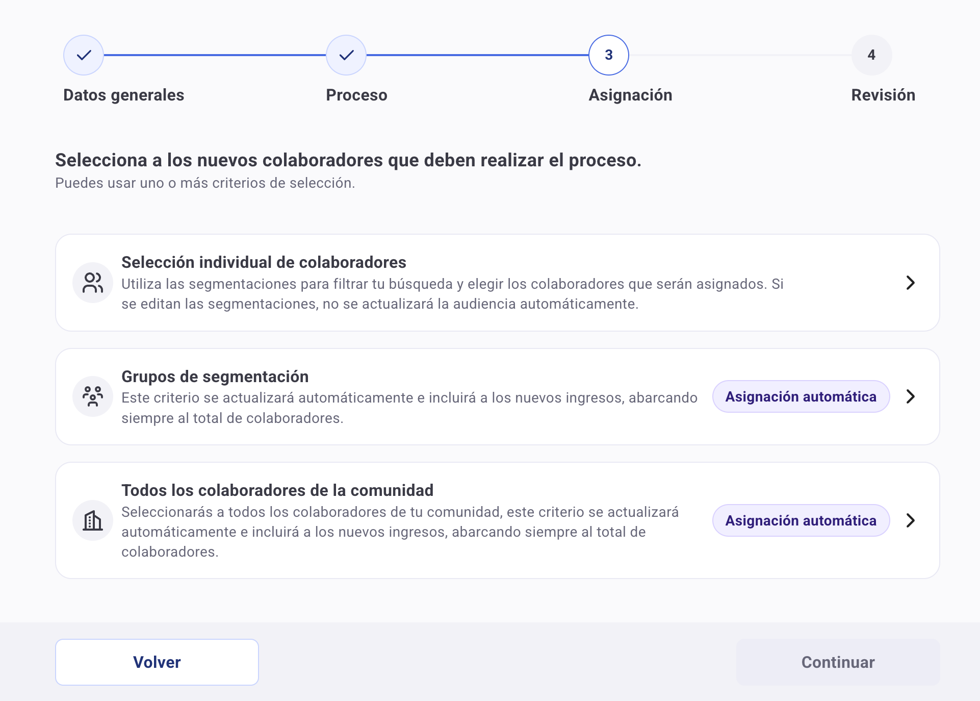 El tercer paso consiste en seleccionar a quienes tendrán que realizar el proceso creado. Se podrá elegir: