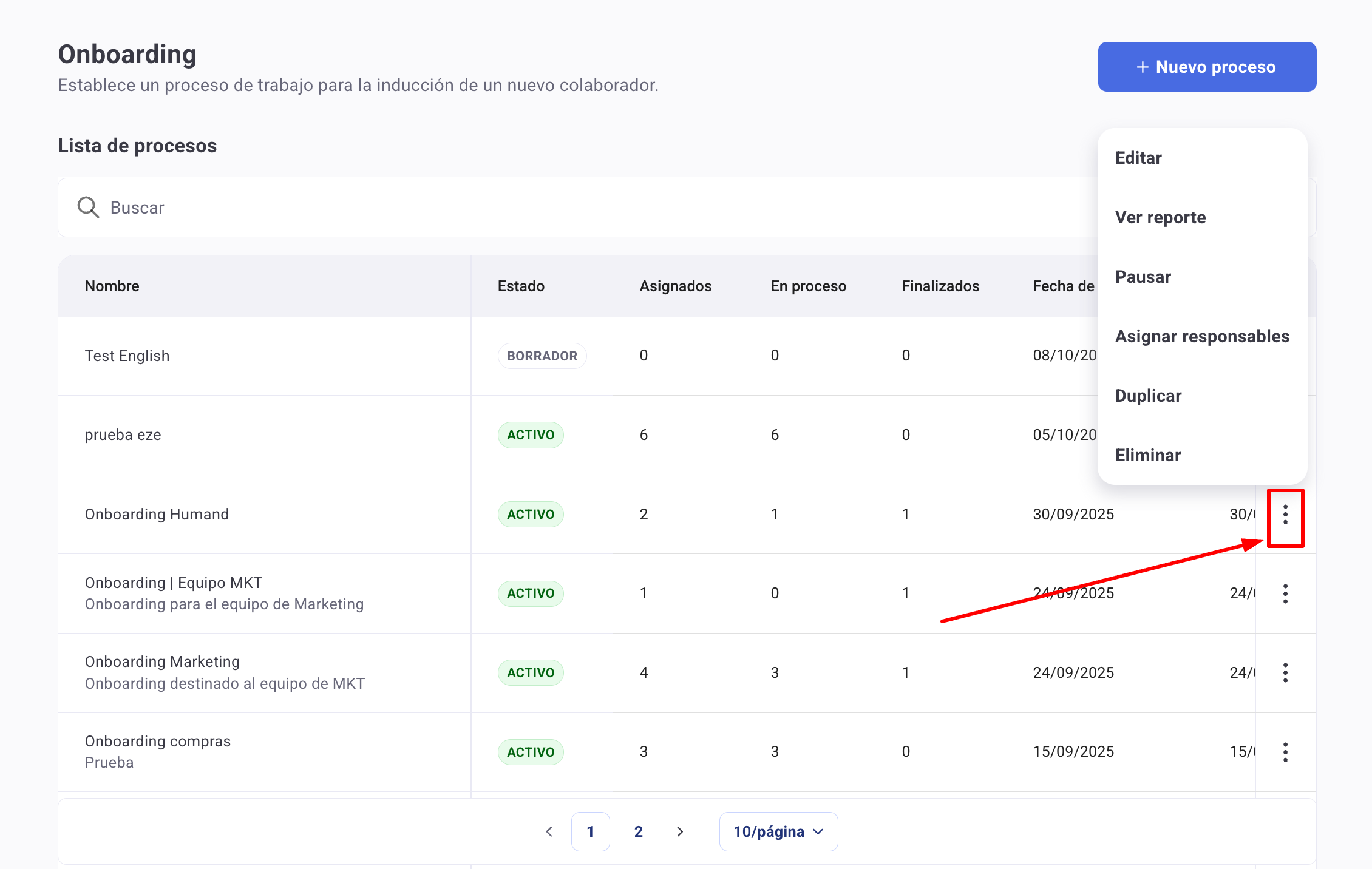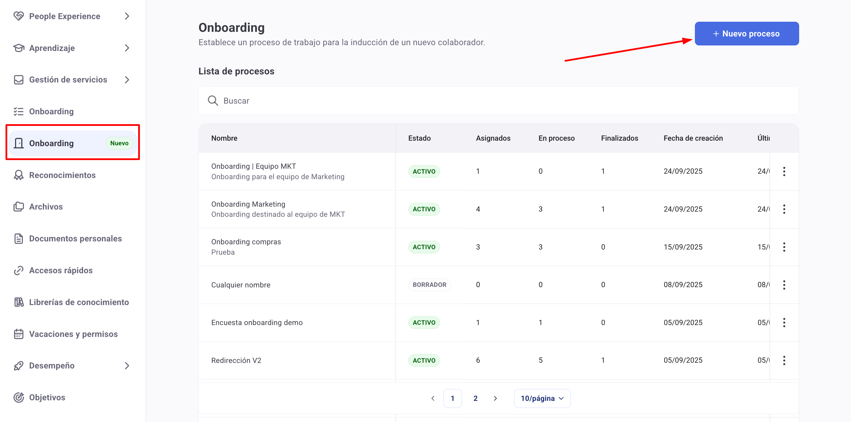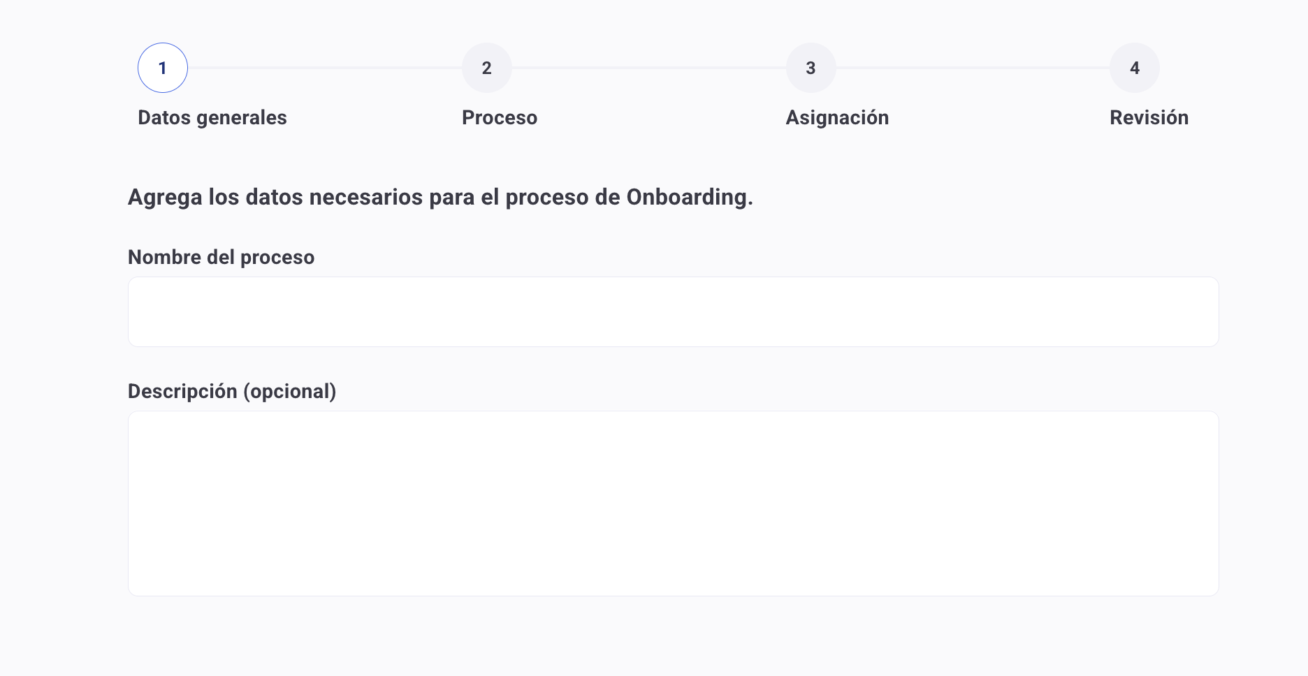 Para crear un nuevo proceso dentro del módulo de Onboarding debes seguir los pasos indicados a continuación: