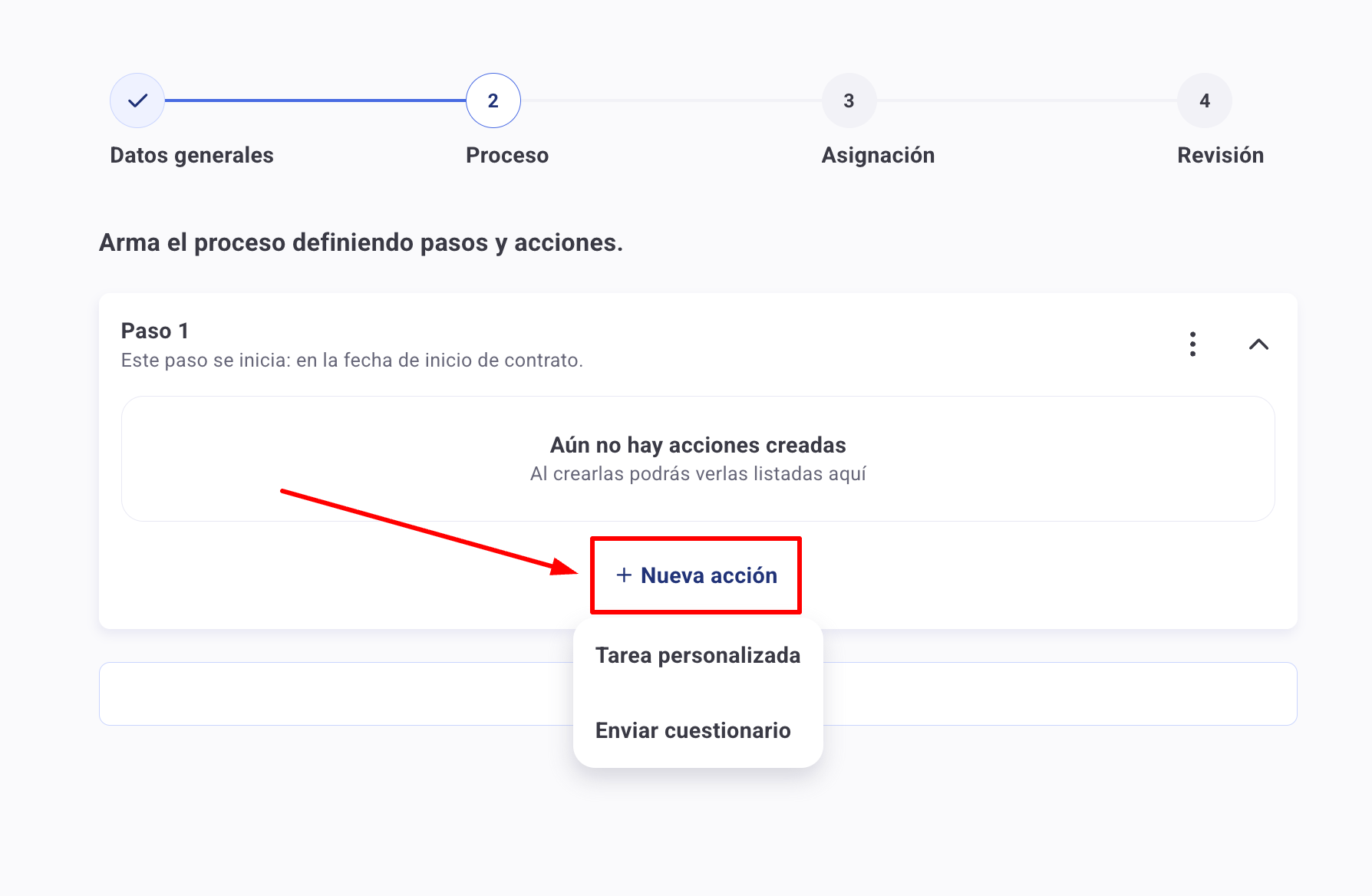 Luego, podremos crear acciones dentro del paso. Las acciones serán los objetos que compongan a cada paso del onboarding, pueden ser tareas personalizadas o cuestionarios.