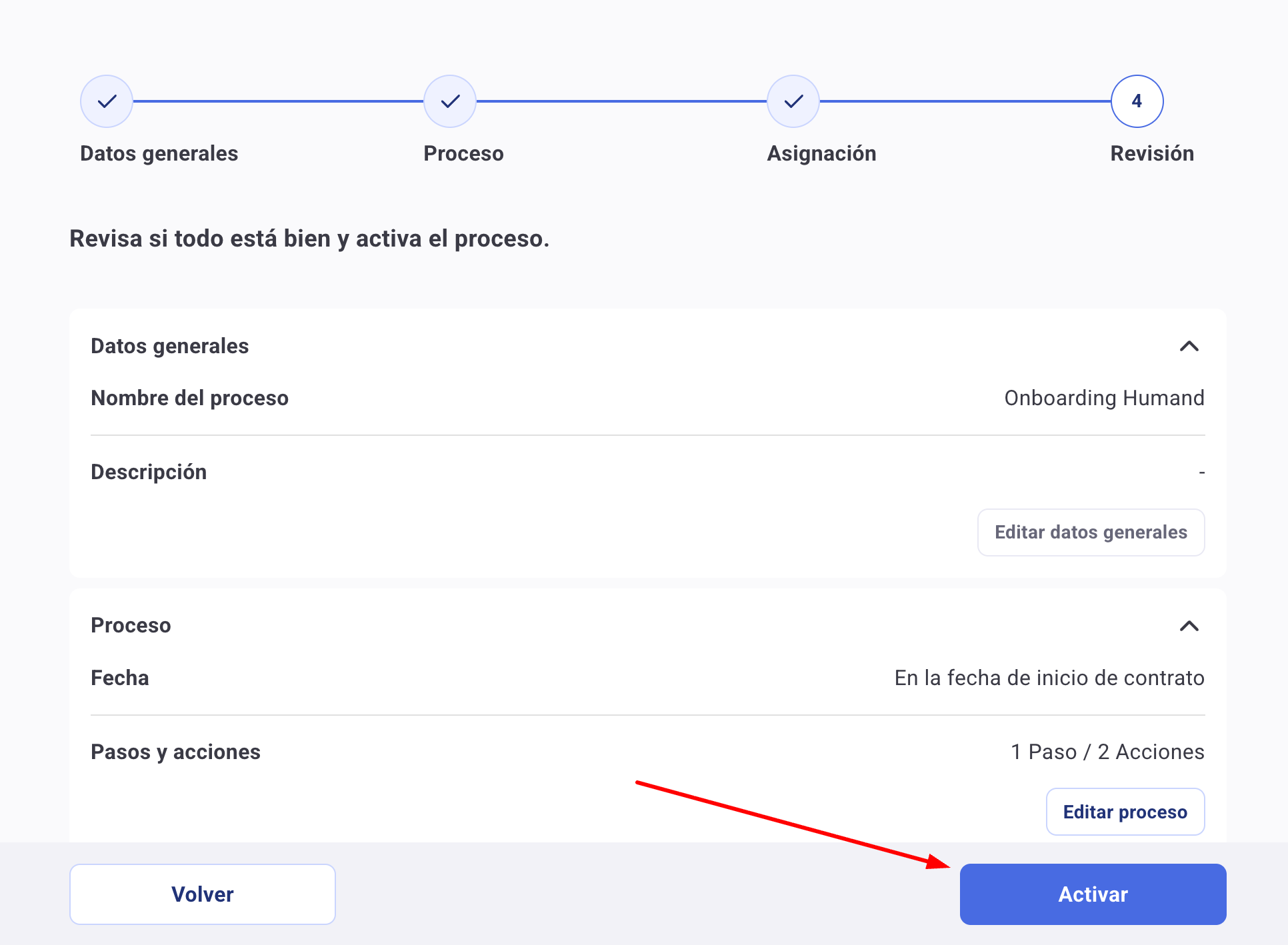 - En esta sección se revisará todo el contenido y la configuración del proceso para confirmar su creación. Una vez confirmada la revisión, haz click en el botón de "Activar" ¡y listo! Ya ha sido creado el proceso.