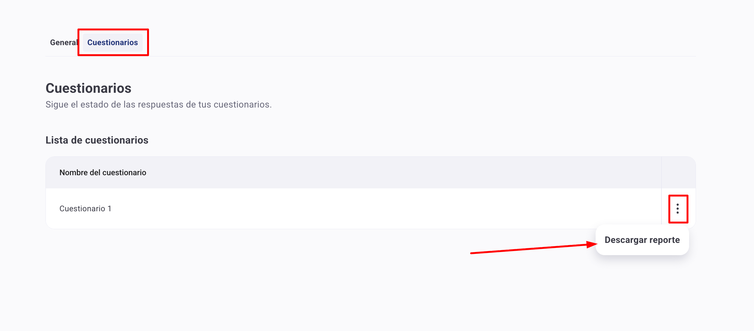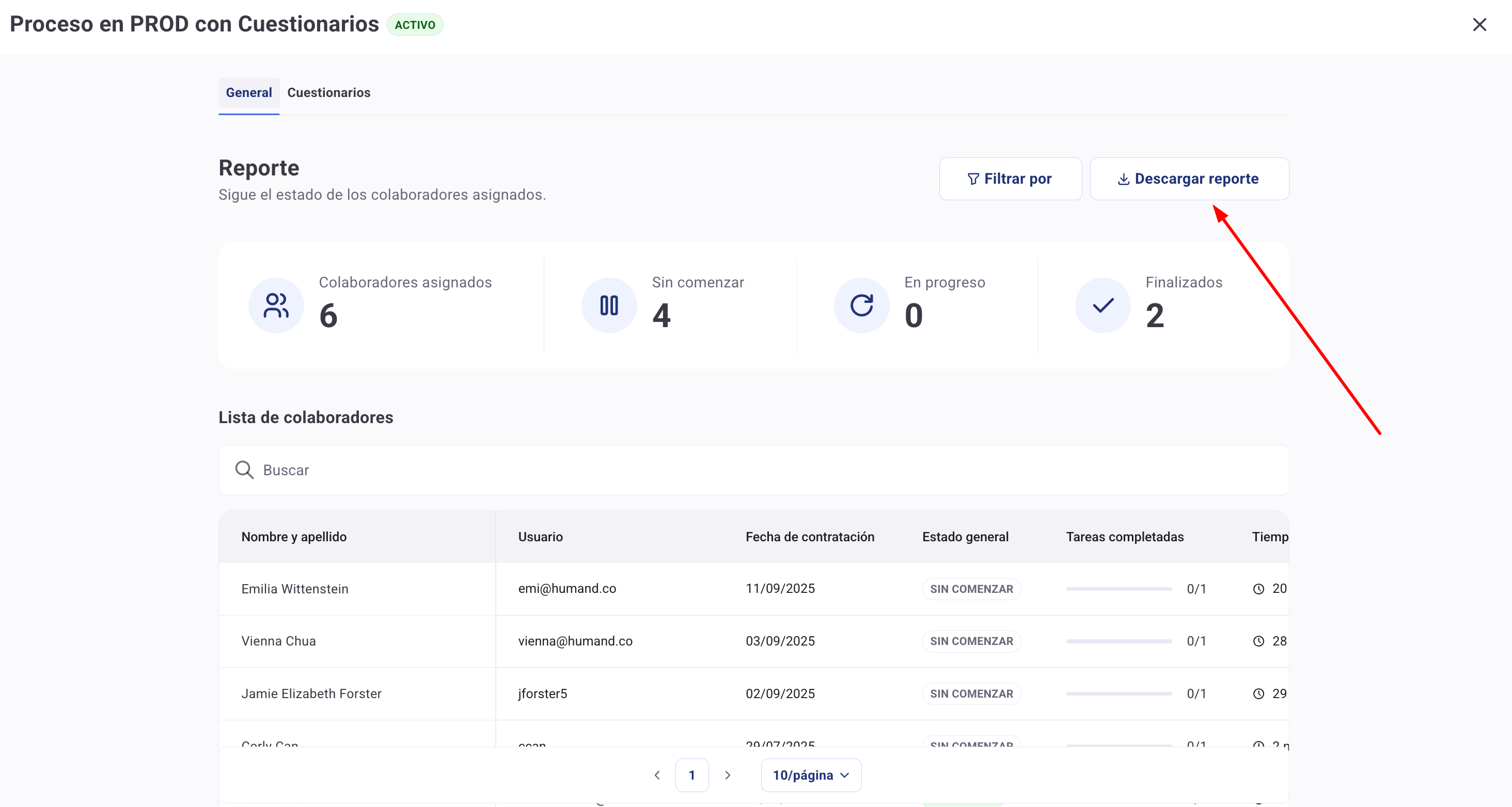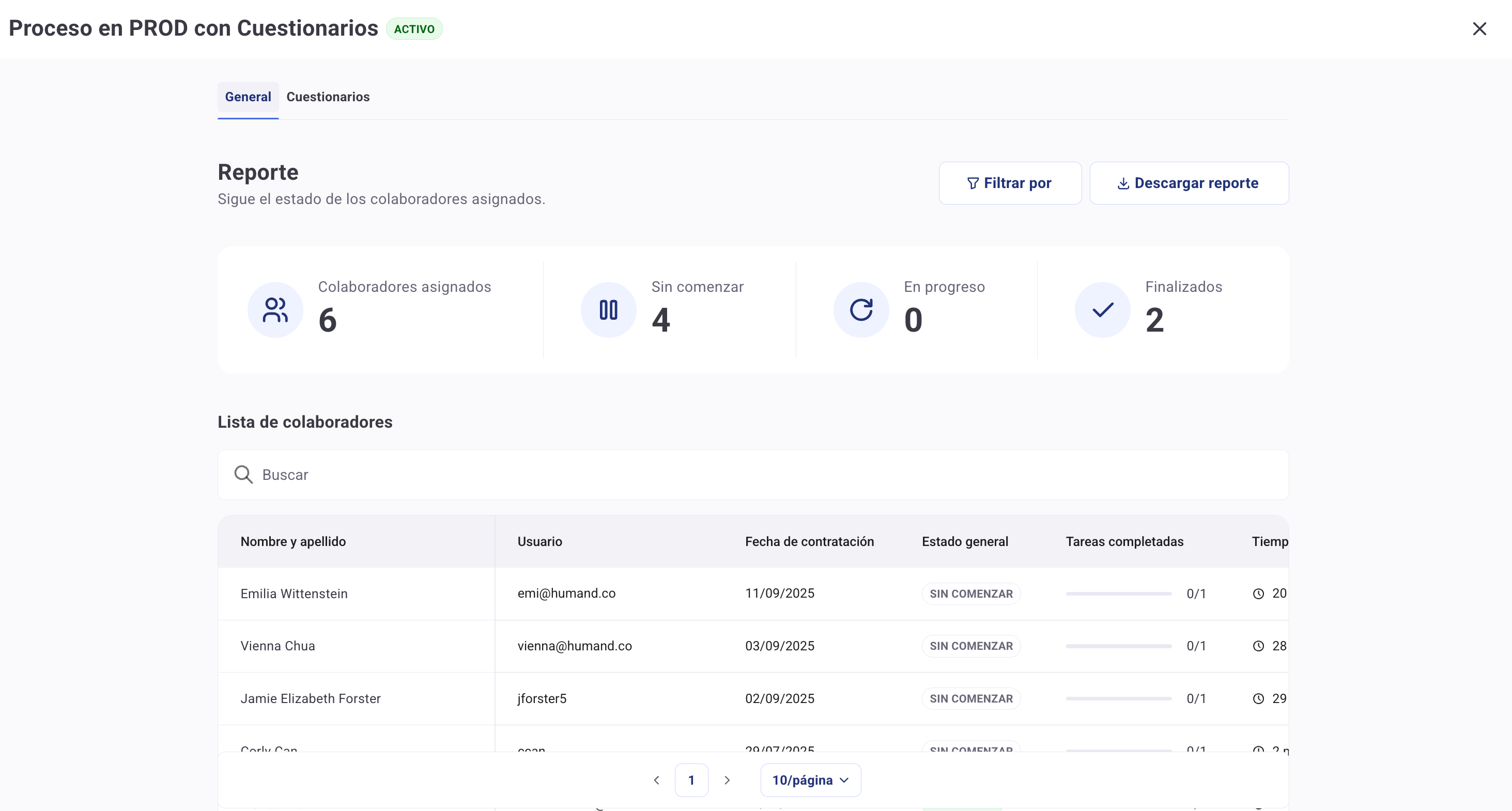 En la pestaña de "Cuestionarios" podrás ver un listado de los cuestionarios que se encuentran dentro de ese proceso y descargar un reporte con las respuestas a los mismos.