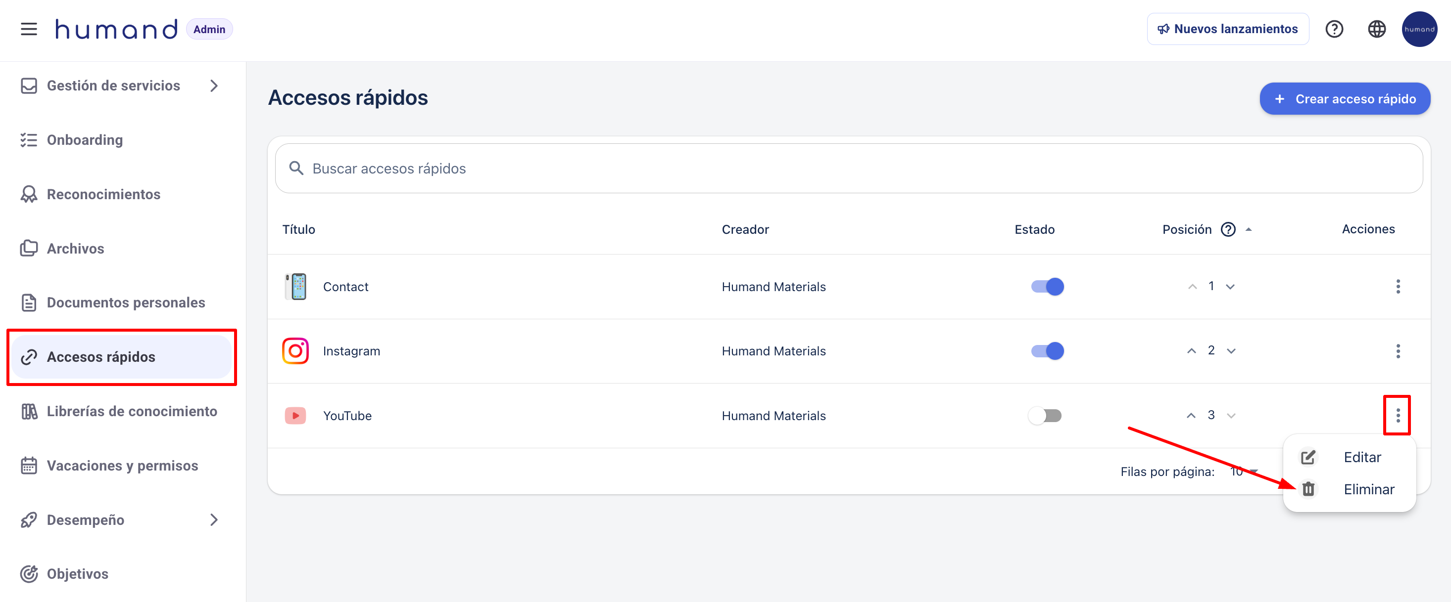 Para eliminar un acceso rápido desde el panel administrador debes seguir los pasos indicados a continuación: